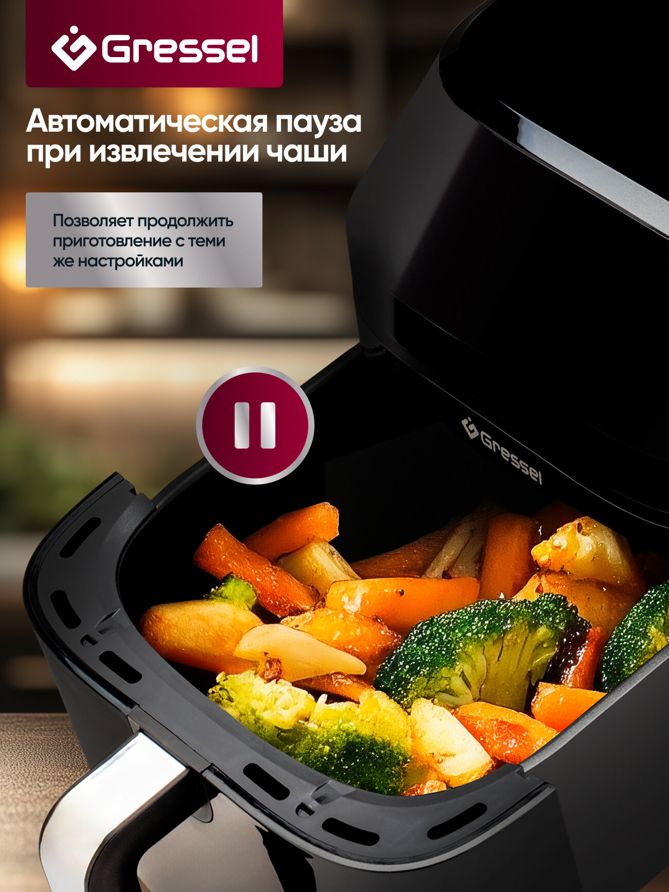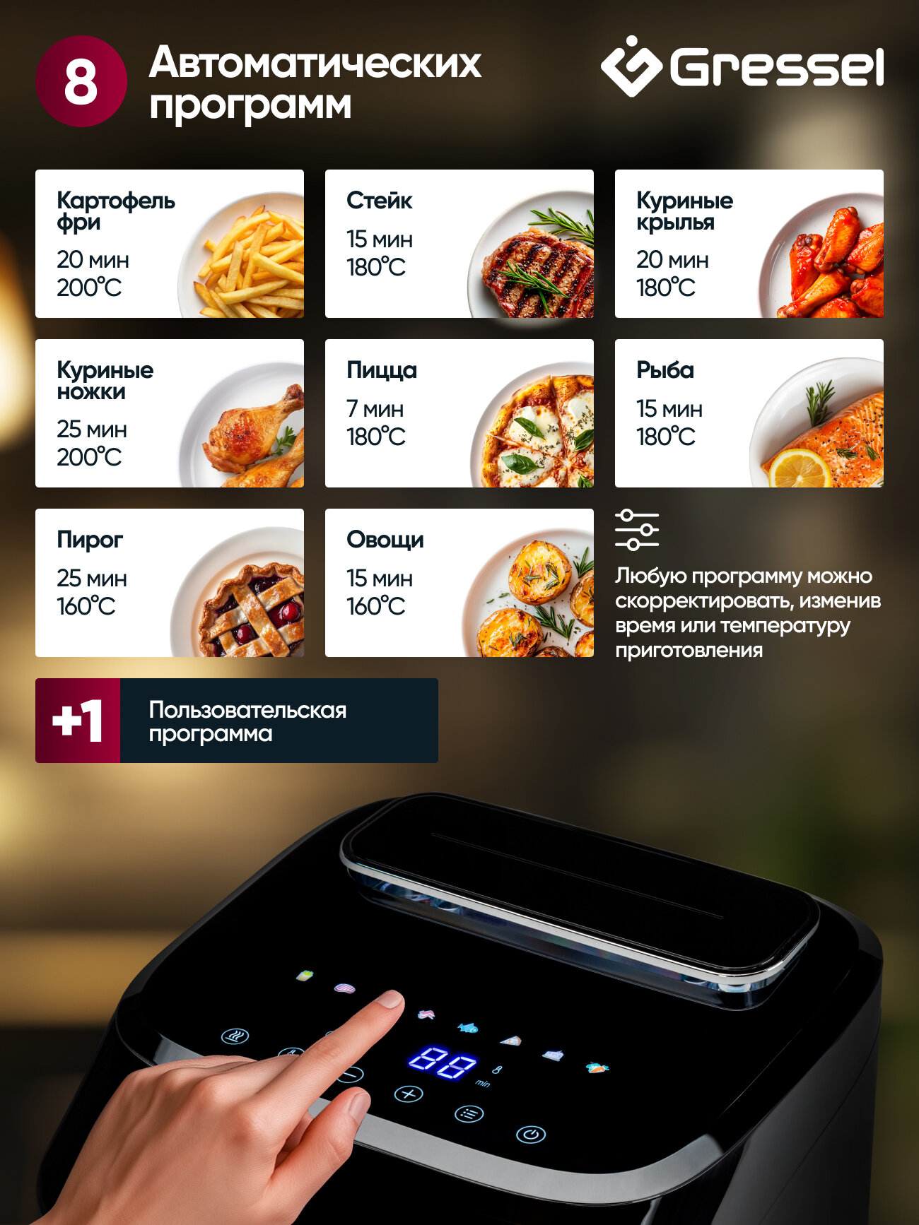 Аэрогриль Gressel GAF-1823, 1800Вт, объём чаши 6.5 литров, 8 программ, сенсорный дисплей, функция пара, самоочистка: сравнение цен, характеристики, фото, актуальное наличие и цены.