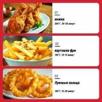 Для идеального результата выбирайте подходящий режим и 8 автоматических программ сделают всё за вас: Картофель фри: хрустящий и золотистый за 12 минут. Наггетсы: нежные внутри, с аппетитной корочкой снаружи. Курица-гриль: сочное мясо с ароматом дымка. Пицца: равномерно пропеченное тесто и расплавленный сыр. Мясо: стейки, котлеты или ребрышки — всегда идеальная прожарка. Рыба: нежная текстура без пересушивания. Овощи: сохраняют витамины и натуральный вкус. Десерты: воздушные кексы, печенье и даже чиабатта.