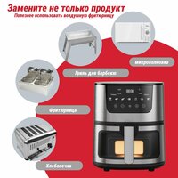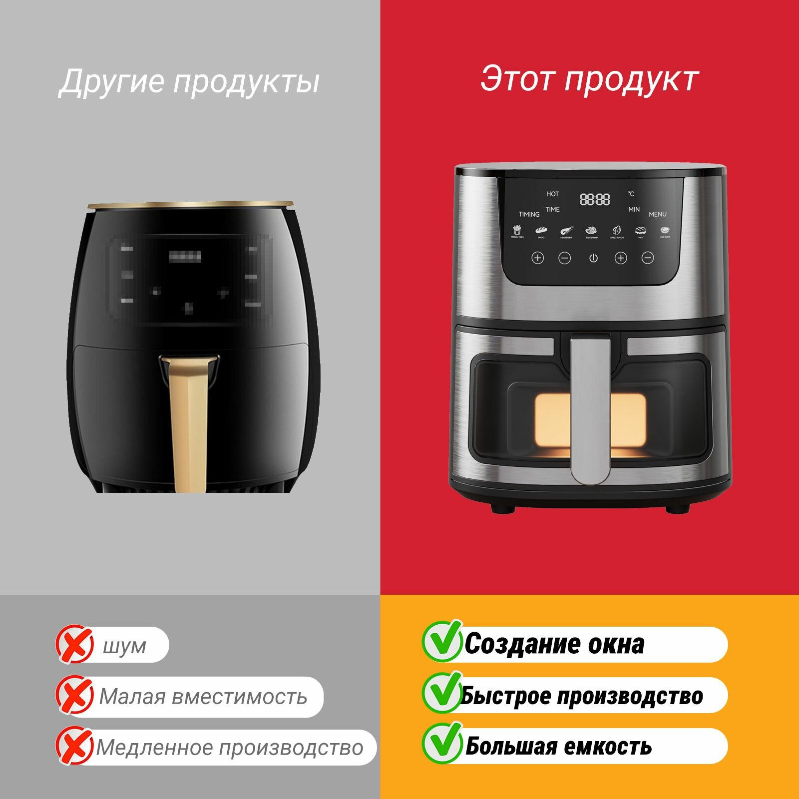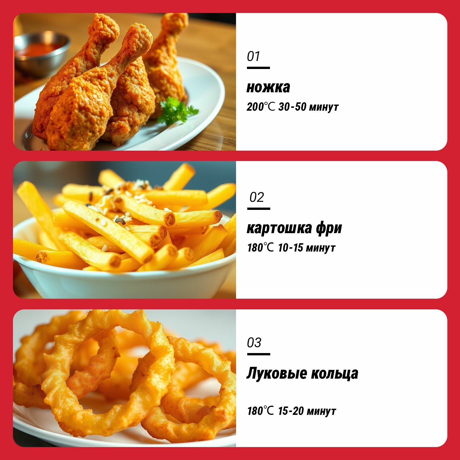 Простота использования и безопасность через интуитивную сенсорную панель. В комплекте — подробная инструкция на русском языке и советы по эксплуатации. Устройство оснащено защитой от перегрева и автоматическим отключением, что делает его безопасным для домашнего использования. Кому подойдет этот аэрогриль? - Семьям, которые хотят готовить полезные блюда без лишнего жира. - Занятым людям, ценящим время и многофункциональность техники. - Любителям экспериментов: от хрустящих закусок до домашней выпечки.