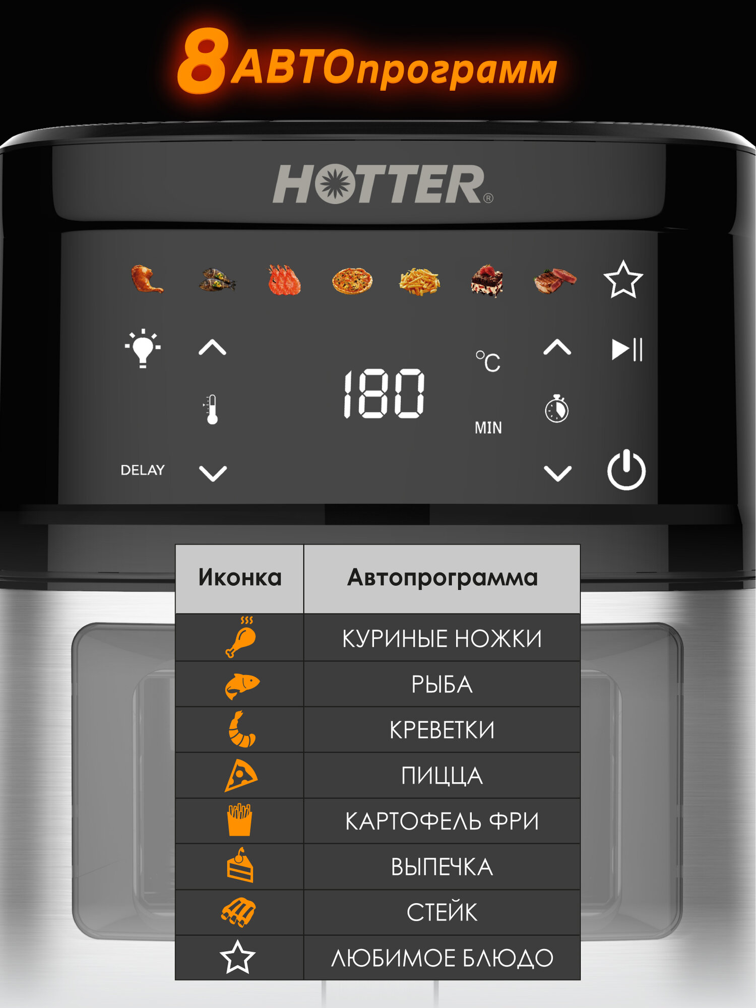 Купить Аэрогриль с двойным нагревом HOTTER HX -850, объем 8,5 л, 8 автопрограмм , мощность 2000 Вт, черный/ металл с доставкой по всей России.