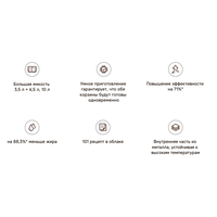 Аэрофритюрница обеспечивает температуру до 230 °C для запекания и до 40–60 °C для размораживания, ферментации и сушки фруктов — универсальный прибор для любых кулинарных нужд.