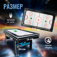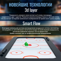 Аэрохоккей BFG ICE TIME 4 разработан и изготовлен специалистами инженерами компании BFG. Самая важная деталь аэрохоккея это - игровое поле. От качества и метода производства этой детали зависит, насколько интересно, захватывающе и увлекательно будет проходить игры. В наших игровых полях применены сразу две новейшие технологии, разработанные инженерами и технологами компании BFG. 1. 3d layer. Поверхность игрового поля состоит из 3 слоев, поочередно соединенных друг с другом. Данный метод позволяет нанести разметку между вторым и третьим слоем, что исключает истирание нанесенного изображения во время всего срока службы. Кроме того используемые материалы обеспечивают длительный период эксплуатации и улучшают скольжение шайбы. 2. Smart Flow. Благодаря уникальной системе распределения воздушного потока, вентилятор, питающийся от сети 220 вольт нагнетаете воздух по всей игровой поверхности, исключая появление мертвых зон во время игры. Шайба скользит как на профессиональном оборудовании. Игровой стол обладает устойчивой конструкцией, что исключает любые раскачивания во время игры. Производимый нами аэрохоккей на 90% состоит из отечественных комплектующих, а это дает возможность быстрого и качественного сервисного обслуживания. Каждый стол оборудован удобными механическими счетами, в комплекте поставляется 2 биты и 4 шайбы. Упаковка имеет жесткое дно, что повышает сохранность товара во время хранения или транспортировки. • Тип игры: Аэрохоккей • Гарантия: 6 месяцев • Цель использования: некоммерческая • Вес брутто / нетто: 47 / 45 кг • Габариты для доставки ШхГхВ (см): 146x84x18 • Размер игрового поля: 1190х580 мм • Размер в разложенном виде: 141х84х79 см • Бита: 2 шт. Ø 60 мм • Шайба: 4 шт. Ø 50 мм • Материал корпуса, опор, игрового поля: ЛДСП, ДВП • Счетчик очков: механический