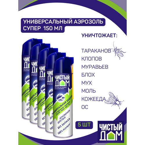 Препарат мгновенного действия, уничтожает все виды ползающих и летающих насекомых. Не оставляет пятен на коврах и мебели. Распыляющая головка двойного действия: обычное распыление и трубка для труднодоступных мест. Одного баллона «Чистый Дом аэрозоль супер» достаточно для обработки 20 кв. м. Все вещества, входящие в состав универсального аэрозоля, безопасны для человека и домашних животных.