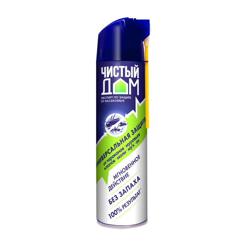 Средство от тараканов, муравьев, мух, клопов, выпускаемое в форме аэрозоля, моментально уничтожает летающих и ползающих насекомых. Для удобства использования есть классический распылитель и откидная тонкая трубка, чтобы упростить обработку труднодоступных мест. Аэрозоль против тараканов и мух «Чистый Дом» рассчитан на обработку 80 м2 помещения. Использовать спрей от насекомых нужно согласно инструкции, в зависимости от того, какой вид вредителей нужно истребить. Обрабатывать жилье следует с закрытыми окнами, чтобы сохранить нужную концентрацию средства в воздухе. После того как насекомые уничтожены, помещение обязательно проветрить 30 минут. Распылять аэрозоль от летающих насекомых нужно не более 3-5 с в помещении около 25-30 м2 либо в местах их обитания, если нужно избавиться от моли или ос. Средство не оставляет пятен и запаха, поэтому его можно использовать для обработки меховых и кожаных изделий, а также на поверхности кроватей и мягкой мебели. Аэрозоль от ползающих насекомых стоит распылять на расстоянии не более 20 см. Наносить средство можно по плинтусам, в щели, под коврами, за радиаторами отопления, на подоконниках.