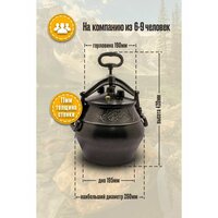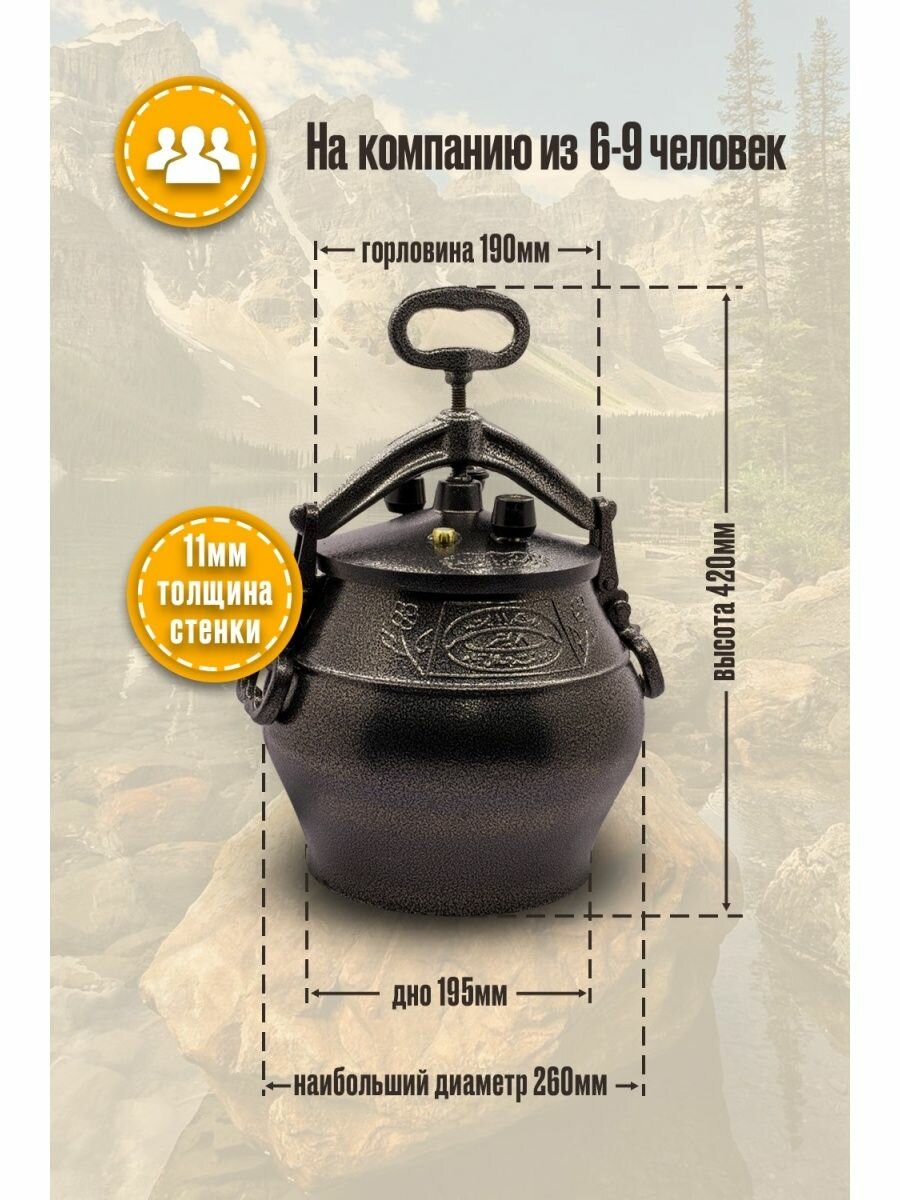 Афганский казан Rashko Baba - это национальная посуда Афганистана, которая используется местными жителями еще с давних времен. Казан афганский, выполненный из качественного литого пищевого алюминия, пользуется большой популярностью благодаря своей уникальной конструкции. Только с виду афганский котелок выглядит необычно, фактически это обычная кастрюля-скороварка, отличающаяся утолщенными стенками и дном, округлой обтекаемой формой и зажимным устройством. За очень небольшое время все ингредиенты успевают пропитаться внутренними соками и ароматами, достичь мягкости и сохранить сочность. Толщина стенок составляет 1 см, за счёт этого поддерживается постоянный высокий уровень температуры и давления. Благодаря этому, еда готовится быстрее, сохраняя полезные свойства продуктов, вкуснее, приобретая соблазнительный аромат блюда и дольше сохраняет тепло. У афганских казанов крышка плотно прилегает к основанию и прикручивается, что не позволяет пару и теплу выйти наружу. Афганский казан подходит для использования не только на открытом огне, но и на газовой и электрической плитах. Для индукционных плит необходим адаптер. Крышка казана снабжена уплотнительной оригинальной резиновой прокладкой для герметичности, двумя основными и одним безопасным клапаном, мини ручкой для съема крышки. Для удобного и безопасного перемещения алюминиевый казан выполнен с двумя выступающими боковыми ручками. Афганский казан посуда многофункциональная: его можно использовать в качестве котелка, сковородки, пароварки или скороварки. Казан с крышкой можно применять не только в домашних условиях, но и на природе. Казанок легкий и компактный, его удобно брать с собой в поход, на рыбалку, на дачу. Производитель ставит объем один, а фактический внутренний объем немного отличается от заявленного. Афганский казан скороварка 5л-4,5л; 8л-6,3л;10л-8,2л;15л-11л;20л-12,5л. Обращаем ваше внимание, что афганская скороварка заполняется на 2/3 объема!