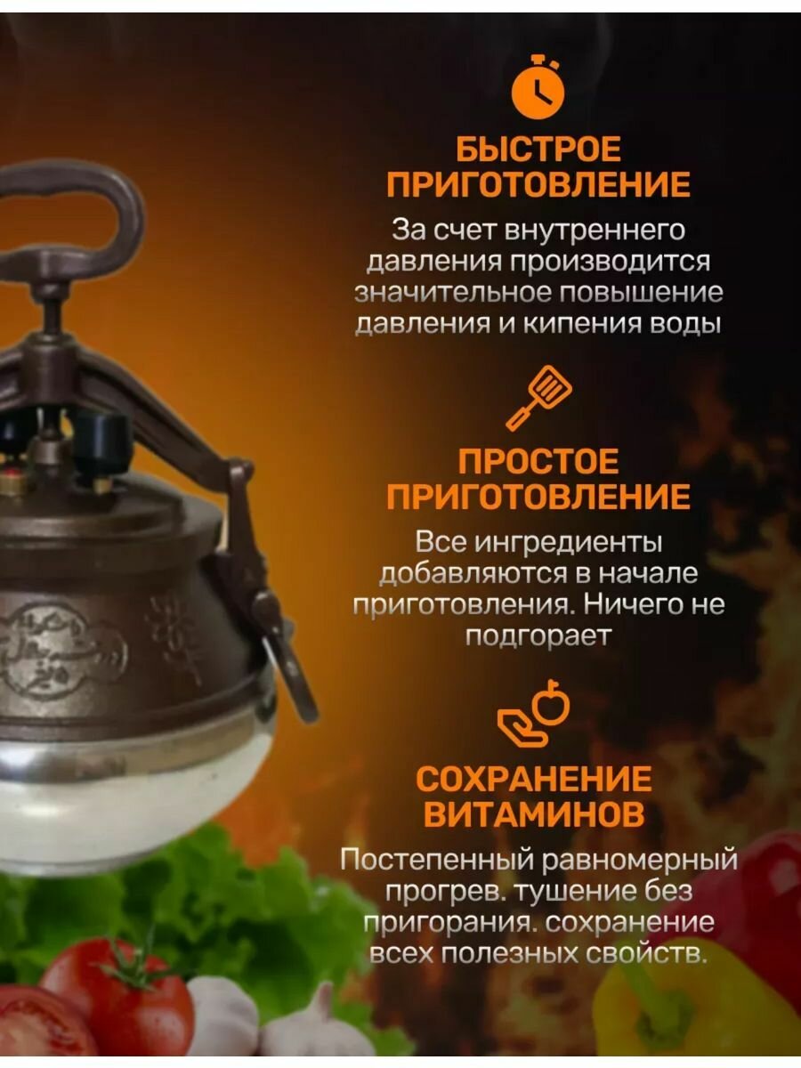 Двухцветный афганский казан скороварка Khan Baba – это красивая традиционная посуда из Афганистана (оригинал), которая поможем быстро приготовить вкусные и полезные блюда. Прогрев внутри осуществляется равномерно, еда не пригорает, как и при использовании посуды с антипригарным покрытием, получается вкусной и ароматной. Подходит для приготовления вкуснейшего плова, супа, жарки и тушения мяса и овощей. Алюминиевый казан имеет небольшой вес и является незаменимым помощником в туризме походной кухне или уличном использовании – посуда идеальна для туристического похода, дачного отдыха, кемпинга, рыбалки, охоты. На природе, можно использовать с подставкой под казан - треногой. Также, казанок отлично подходит для домашнего использования на газовых, электрических плитах, газовых плитках. Его можно использовать как казан, котелок, скороварку, пароварку. Готовить можно с использованием металлических приборов шумовок и половников и другой утвари. Он может заменить привычные сковороды и кастрюли. Оснащен подвижными ручками для безопасного перемещения, имеет 3 клапана (2 рабочих и один аварийный), который предотвращает срыв крышки и надежным замком для плотной фиксации затвора к корпусу. В крышке установлена уплотнительная резиновая оригинальная прокладка. Снаружи казан окрашен жаропрочной краской. Плоское дно, диаметром 17 см, позволяет готовить на варочных поверхностях, но на индукционной плите возможно использование только со специальным адаптером. Обратите внимание, что фактический объем казана меньше, информацию об этом Вы можете найти в соответствующем фото. Полезный объём казана 65-80%, при загрузке более этой нормы возникает вероятность засорения клапана. Подходит до 8 персон. Казан — это отличный подарок!