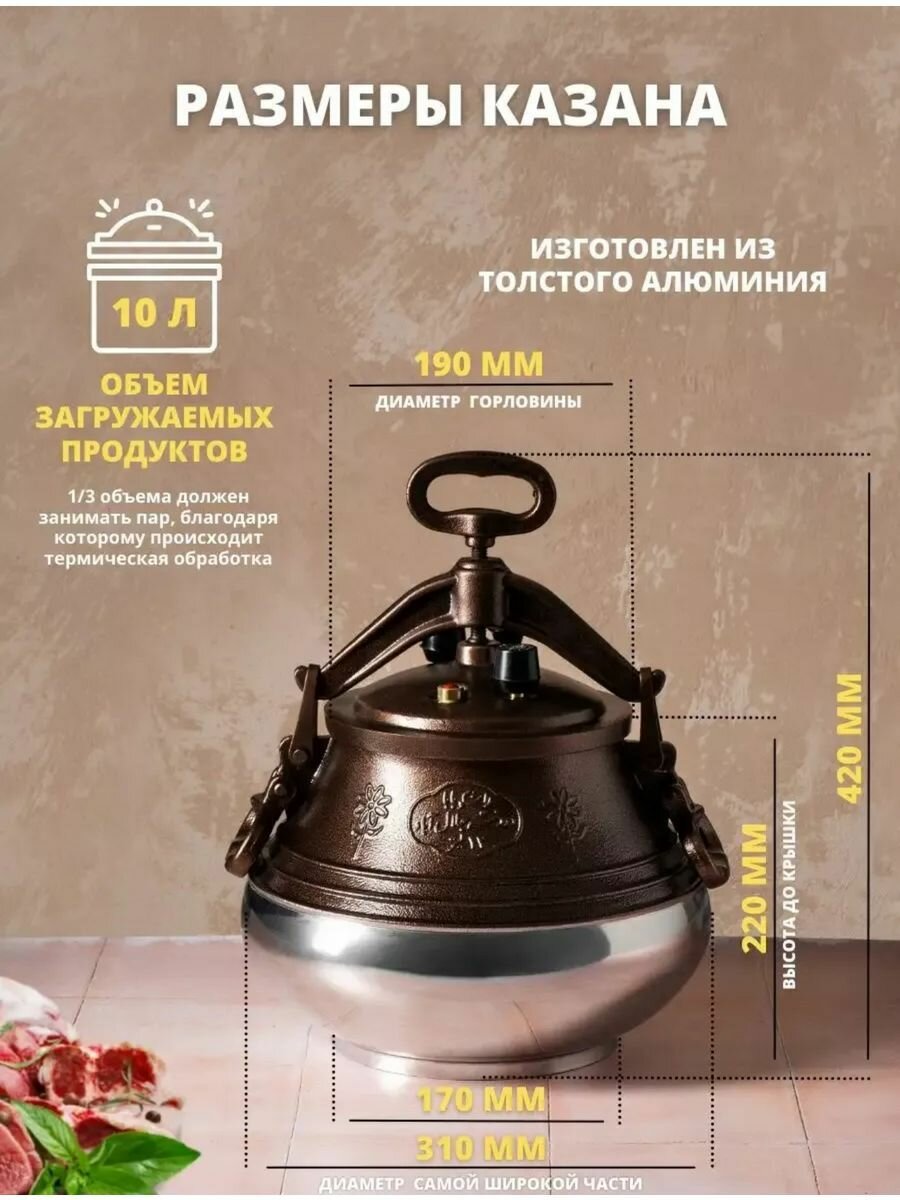 Двухцветный афганский казан скороварка Khan Baba – это красивая традиционная посуда из Афганистана (оригинал), которая поможем быстро приготовить вкусные и полезные блюда. Прогрев внутри осуществляется равномерно, еда не пригорает, как и при использовании посуды с антипригарным покрытием, получается вкусной и ароматной. Подходит для приготовления вкуснейшего плова, супа, жарки и тушения мяса и овощей. Алюминиевый казан имеет небольшой вес и является незаменимым помощником в туризме походной кухне или уличном использовании – посуда идеальна для туристического похода, дачного отдыха, кемпинга, рыбалки, охоты. На природе, можно использовать с подставкой под казан - треногой. Также, казанок отлично подходит для домашнего использования на газовых, электрических плитах, газовых плитках. Его можно использовать как казан, котелок, скороварку, пароварку. Готовить можно с использованием металлических приборов шумовок и половников и другой утвари. Он может заменить привычные сковороды и кастрюли. Оснащен подвижными ручками для безопасного перемещения, имеет 3 клапана (2 рабочих и один аварийный), который предотвращает срыв крышки и надежным замком для плотной фиксации затвора к корпусу. В крышке установлена уплотнительная резиновая оригинальная прокладка. Снаружи казан окрашен жаропрочной краской. Плоское дно, диаметром 17 см, позволяет готовить на варочных поверхностях, но на индукционной плите возможно использование только со специальным адаптером. Обратите внимание, что фактический объем казана меньше, информацию об этом Вы можете найти в соответствующем фото. Полезный объём казана 65-80%, при загрузке более этой нормы возникает вероятность засорения клапана. Подходит до 10 персон. Казан — это отличный подарок!