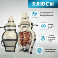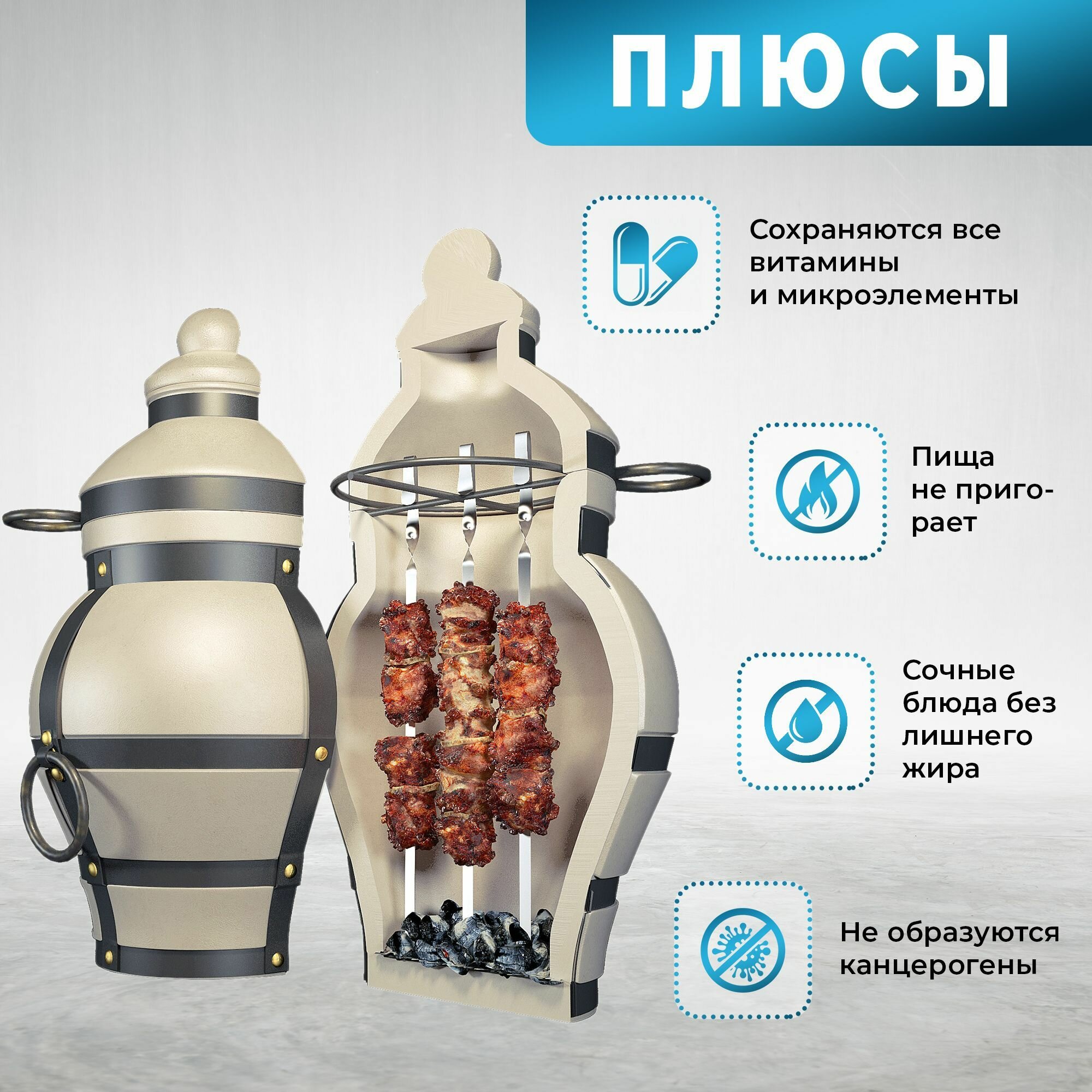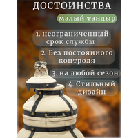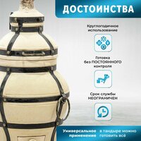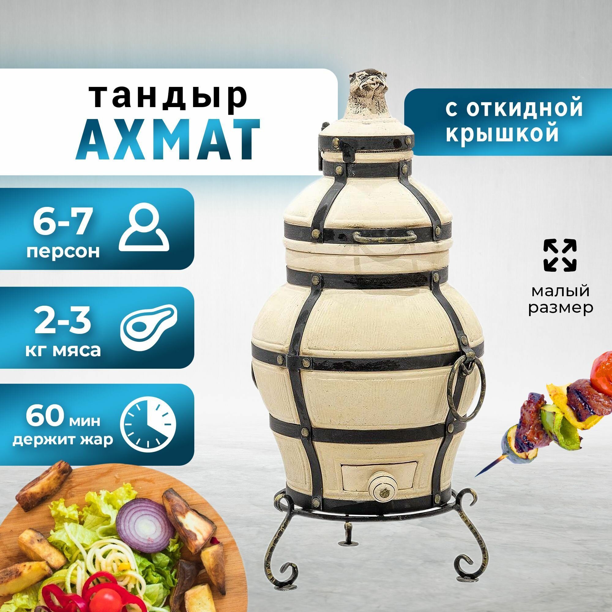 Переносной тандыр Ахмат отличный помощник в готовке свежей, вкусной и полезной еды на открытом воздухе, в разогретом состоянии держит теплоту от 2 до 3 с половиной часов, располагая к приготовлению мяса до пяти килограмм за один розжиг и много разнообразных и аппетитных блюд на Ваш вкус. Например - сочный мясной шашлык, рыбку, овощи, хлеб, самсу. С помощью этой замечательной печки можно накормить большую компанию. Кувшин обладает высокой теплопроводностью, экологичностью, прочностью, а срок эксплуатации больше 10 лет и отлично подойдет на подарок мужчине на день рождения. Глиняный округлый бочонок имеет: колпачок, не позволяющий утрачивать тепло при открывании, и откидную крышку с комфортными ручками, что позволяет легко открывать его и закладывать в него продукты. Выкованная ножка помогает в удобном использовании тандыра. Изюминку ему придаёт красивый декоративный узор, который расположен в центральной его части. Жаровня приятного бежевого цвета, центр коричневого оттенка, где находится орнамент и сверху нанесена глазурь, которая защищает его от влаги и грязи. Керамический сосуд изготовлен из шамотной глины высокотемпературной обработки. При каждом использовании на стенках сосуда появляются «волосковые» трещины — глина «дышит» и покрывается особым эксклюзивным орнаментом. Для того, чтобы они были менее незаметными, необходимо при первом розжиге температуру в тандыре поднимать максимально плавно.