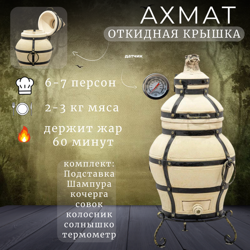 Тандыр Ахмат-это керамическая печь, что в разогретом состоянии держит жар в течение 1,5-2 часов и представляет собой глиняный сосуд, который нагревается до высокой температуры и затем используется для запекания мяса, рыбы, овощей и лепёшек.