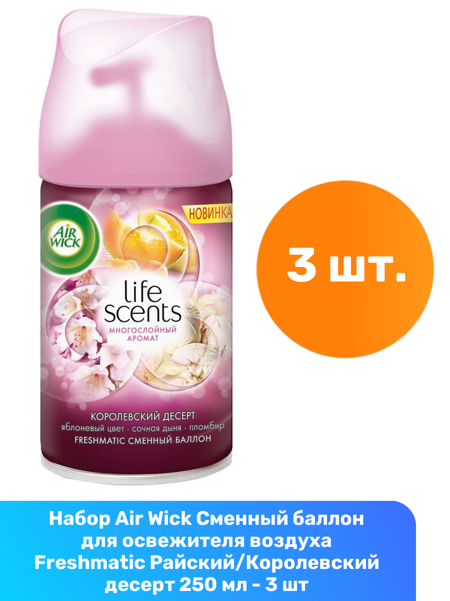 Купить Air Wick Сменный баллон для освежителя воздуха Freshmatic Райский/Королевский десерт 250 мл — 3 шт с доставкой по всей России. Air Wick Сменный баллон для освежителя воздуха Freshmatic Райский/Королевский десерт 250 мл — 3 шт: сравнение цен, характеристики, фото, актуальное наличие и цены.