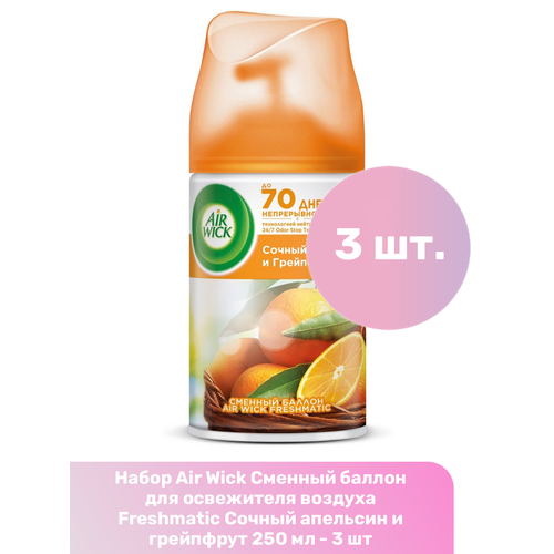 Купить Air Wick Сменный баллон для освежителя воздуха Freshmatic Сочный апельсин и грейпфрут 250 мл — 3 шт с доставкой по всей России. Air Wick Сменный баллон для освежителя воздуха Freshmatic Сочный апельсин и грейпфрут 250 мл — 3 шт: сравнение цен, характеристики, фото, актуальное наличие и цены.