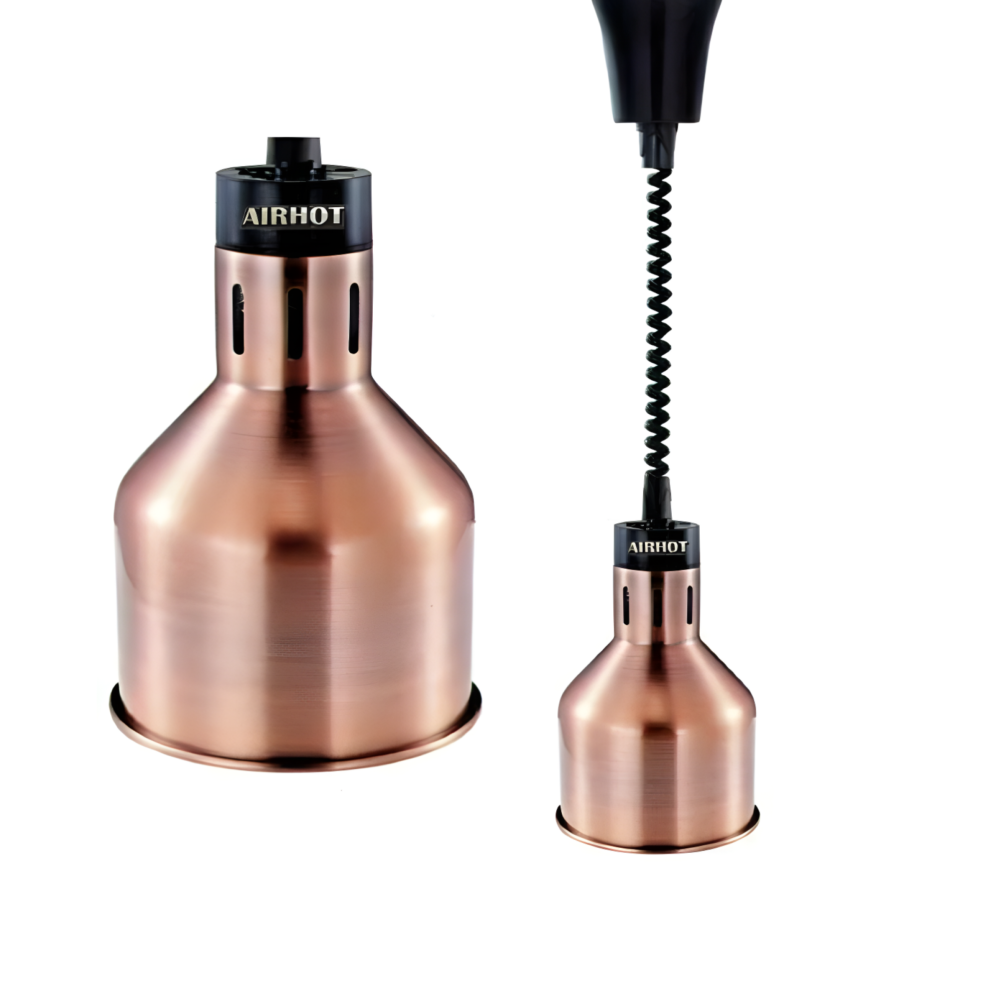 Подвесная инфракрасная лампа Airhot IR-C-775 бронзовый с 1-й зоной нагрева. Используется на предприятиях общественного питания и торговли для поддержания в нагретом состоянии посуды и готовых блюд. Использование подогревателя позволяет избежать повторного разогрева, что благоприятно сказывается на внешнем виде и вкусовых качествах продукта. Особенности: Механизм регулировки и фиксации по высоте Диапазон регулировки по высоте: от 600 до 1500 мм Цвет плафона: бронзовый Материал корпуса — окрашенный металл В комплект поставки входит: Лампочка 250 Вт