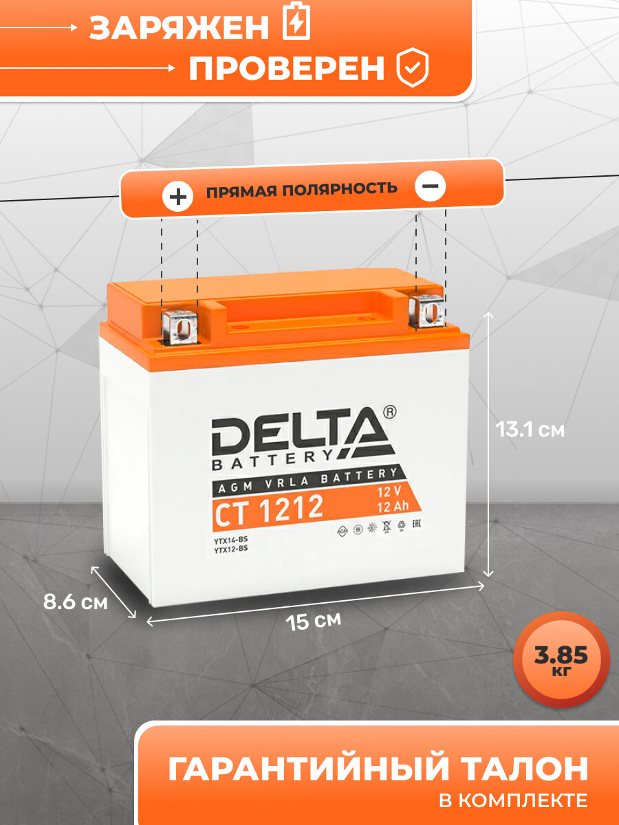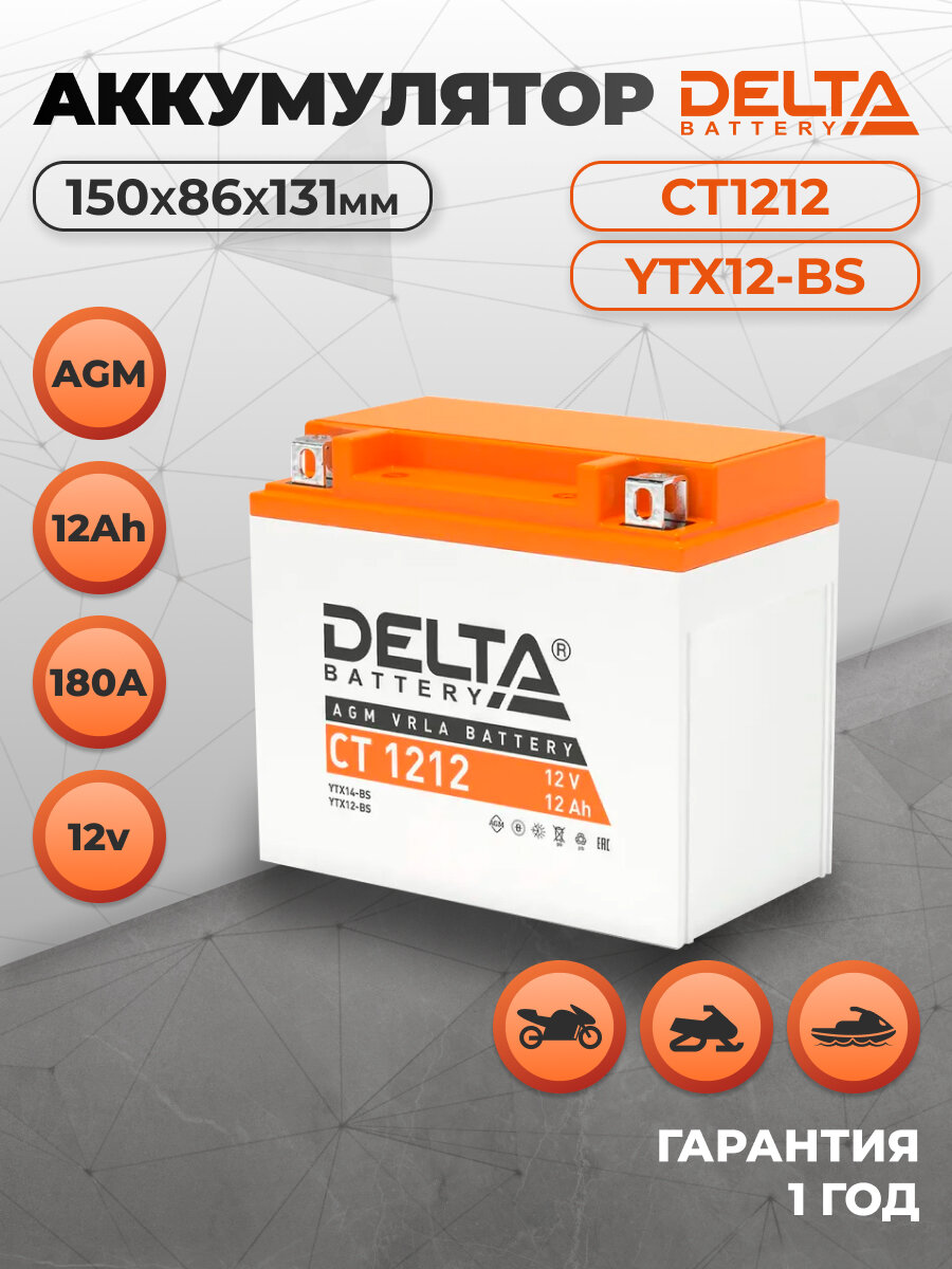 Аккумулятор мото DELTA AGM CT 1212 12Ah 180A прямая полярность (150х86х130) мотоцикла: сравнение цен, характеристики, фото, актуальное наличие и цены.