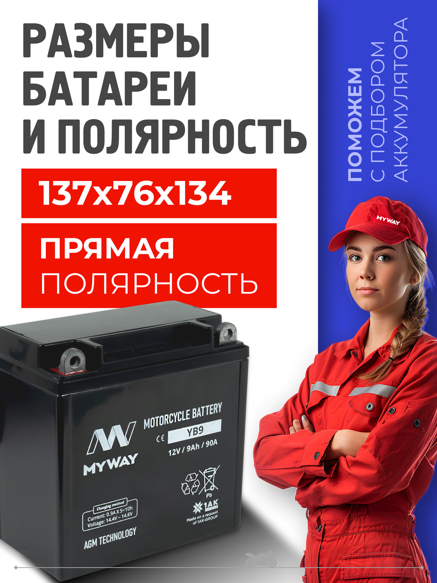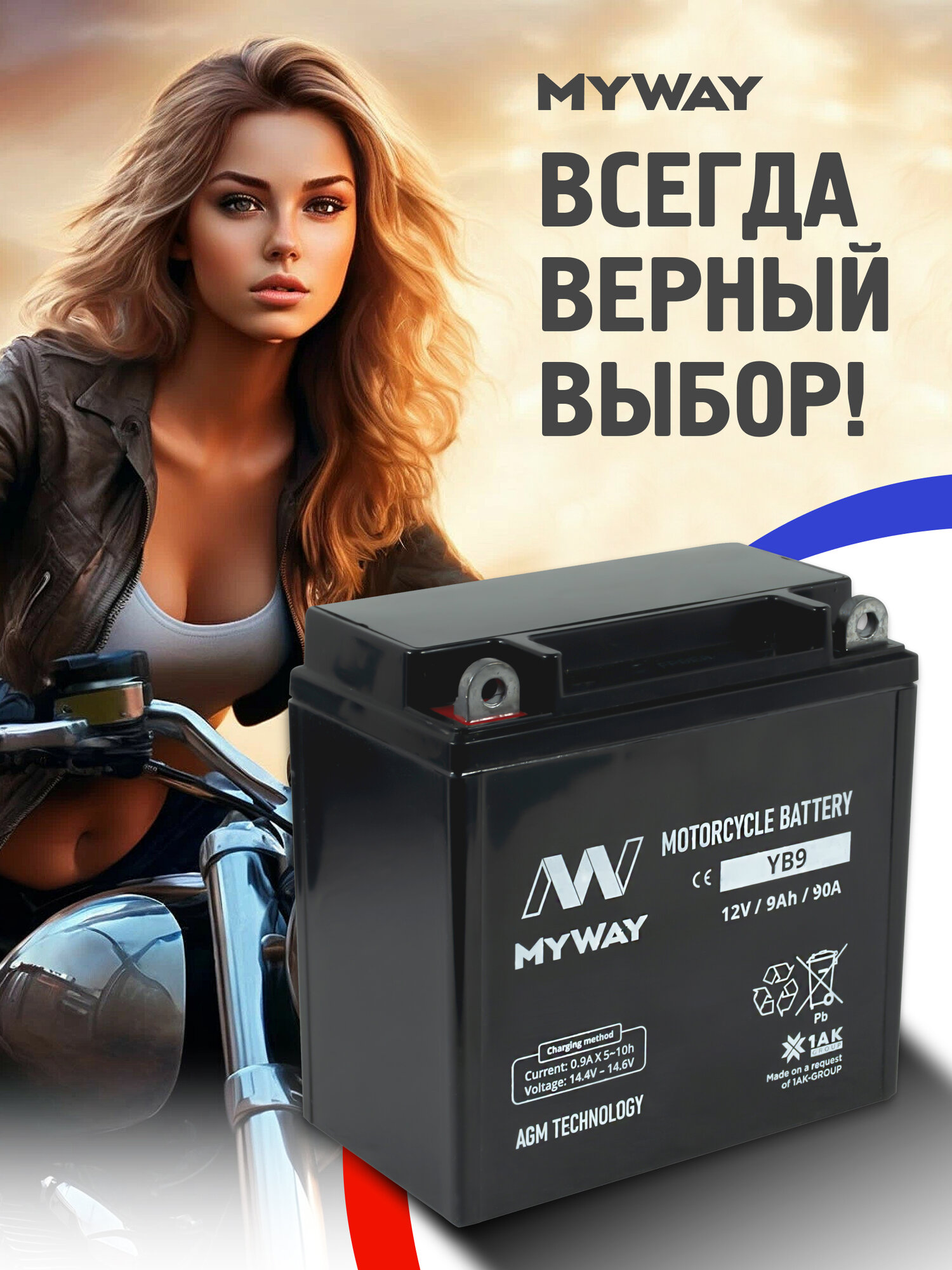 Мото аккумулятор 12 вольт 9 ампер MYWAY YB9-BS AGM обеспечивает длительный срок службы и превосходную производительность даже в самых экстремальных условиях. Правильно подобранный акб мотоцикла 12в 9ач – гарантия длительной поездки и нормального запуска ДВС.