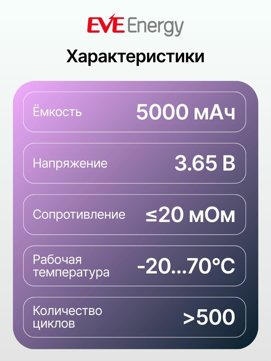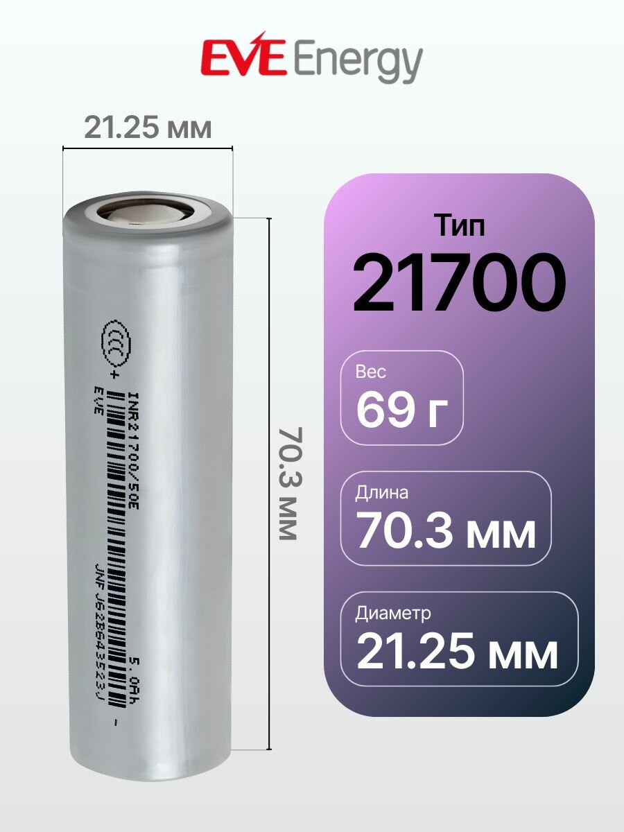 Аккумулятор 21700 5000 мАч INR21700-50E EVE Energy 3.6 В, Li-Ion среднетоковый с плоским электродом, 8 штук: сравнение цен, характеристики, фото, актуальное наличие и цены.