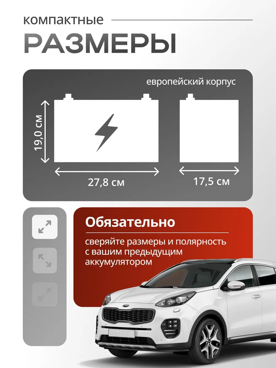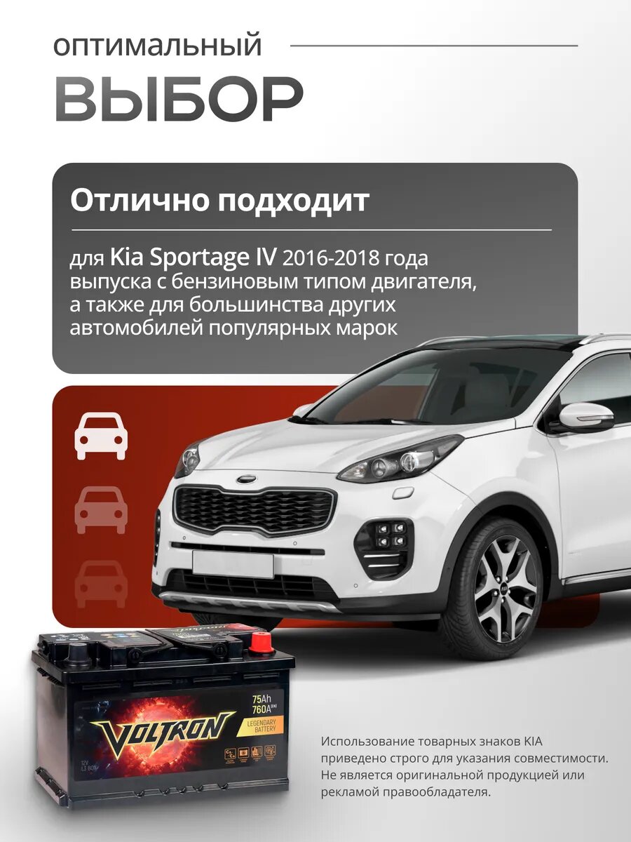 Автомобильный аккумулятор для Kia Sportage 75 Ah Voltron — это оптимальное сочетание качества, надежности и доступной цены, идеально подходящее для большинства легковых автомобилей. Батарея разработана с учетом потребностей современных автолюбителей, обеспечивая надежный запуск двигателя и стабильное питание электрооборудования. Стандартное количество пластин, выполненных по технологиям Ca-Ca и Ex-Met, обеспечивает аккумулятору авто приемлемый рабочий ресурс на протяжении всего периода эксплуатации. Акб автомобильный 75 предназначен для машин с умеренным количеством потребителей энергии и обеспечивает необходимую базовую мощность для уверенного запуска в любых погодных условиях. Кальциевый стартерный аккумулятор для машины поддерживает стабильное напряжение 12 вольт 75ач, что делает его универсальным автотоваром. Аккумулятор для Киа Спортейдж 4 идеально подойдет для авто с бензиновым типом двигателя. Специальная система защиты от искр и утечек обеспечивает безопасность повседневного использования аккумулятора для автомобиля 70 обратная полярность. Удобная ручка способствует быстрой и легкой установке запчасти на борт транспортного средства. При производстве аккумуляторных батарей 12в 75 ампер часов Voltron на газель 75, рено дастер, логан, киа оптима, kia sportage, toyota, ладу ларгус, шкоду, фольксваген, опель, ниссан применяются современные технологии, обеспечивающие увеличенный срок службы. Качество исполнения и возможность самостоятельного обслуживания делают автобатарею незаменимым аксессуаром в машину и отличным подарком мужчине. Выбирая белорусский свинцово-кислотный аккумулятор 12v 80ah, вы получаете долговечный источник питания, гарантию спокойствия и уверенности в любом путешествии. Voltron — стабильность на каждом километре пути!