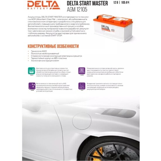 Аккумуляторные батареи Delta Start Master изготавливаются по технологии AGM (Absorbent Glass Mat) и разработаны специально для автомобилей с повышенными требованиями к энергопотреблению и адаптированы для применения с системой START-STOP.
