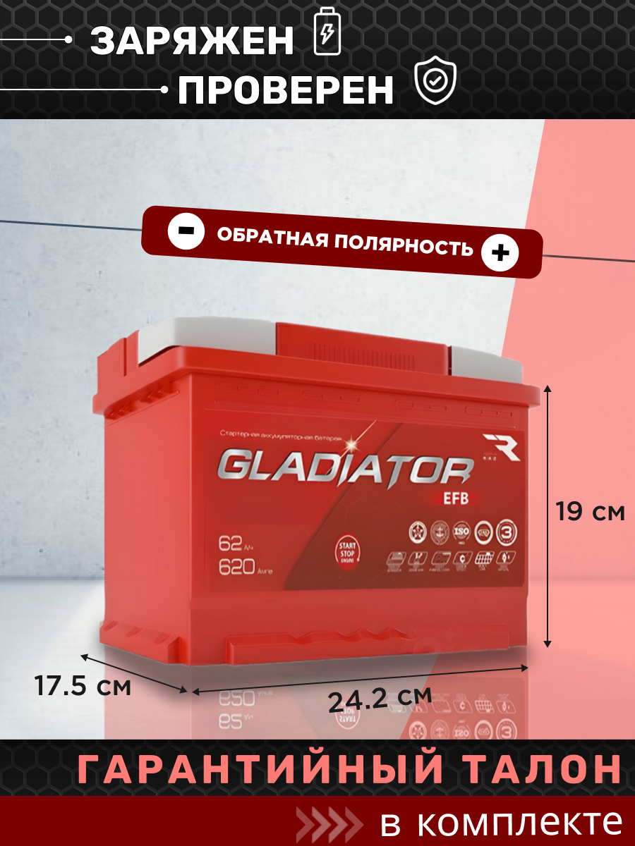 Аккумулятор автомобильный GLADIATOR EFB 62Ah 620А обратная полярность (242х175х190): сравнение цен, характеристики, фото, актуальное наличие и цены.