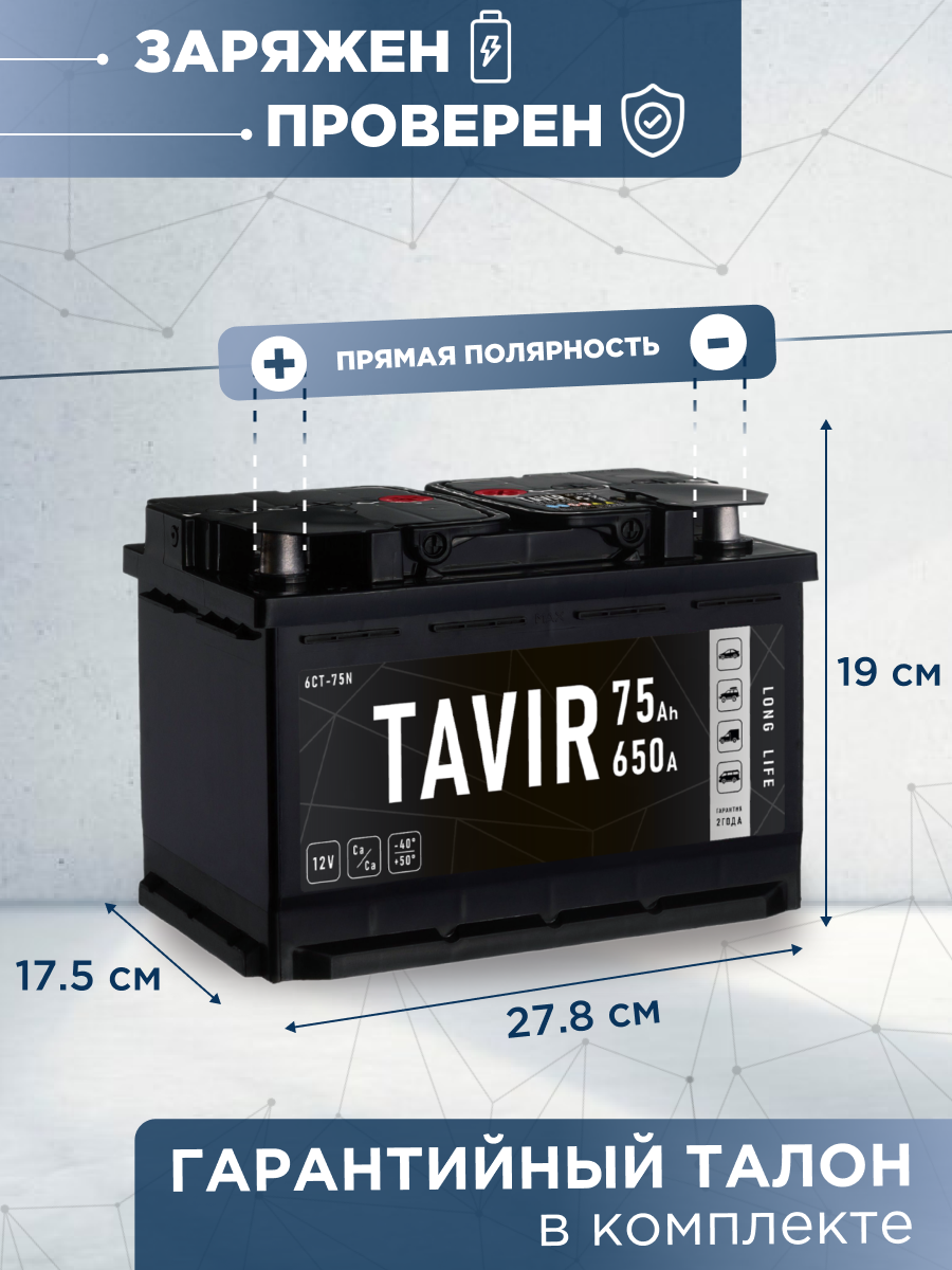 Купить Аккумулятор автомобильный TAVIR 75Ah 650А прямая полярность (278x175x190) с доставкой по всей России. Аккумулятор автомобильный TAVIR 75Ah 650А прямая полярность (278x175x190): сравнение цен, характеристики, фото, актуальное наличие и цены.