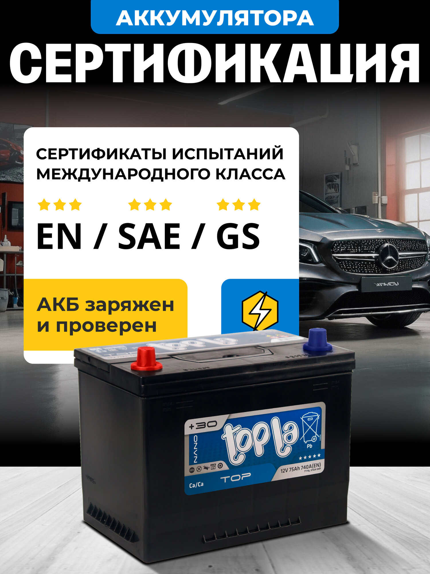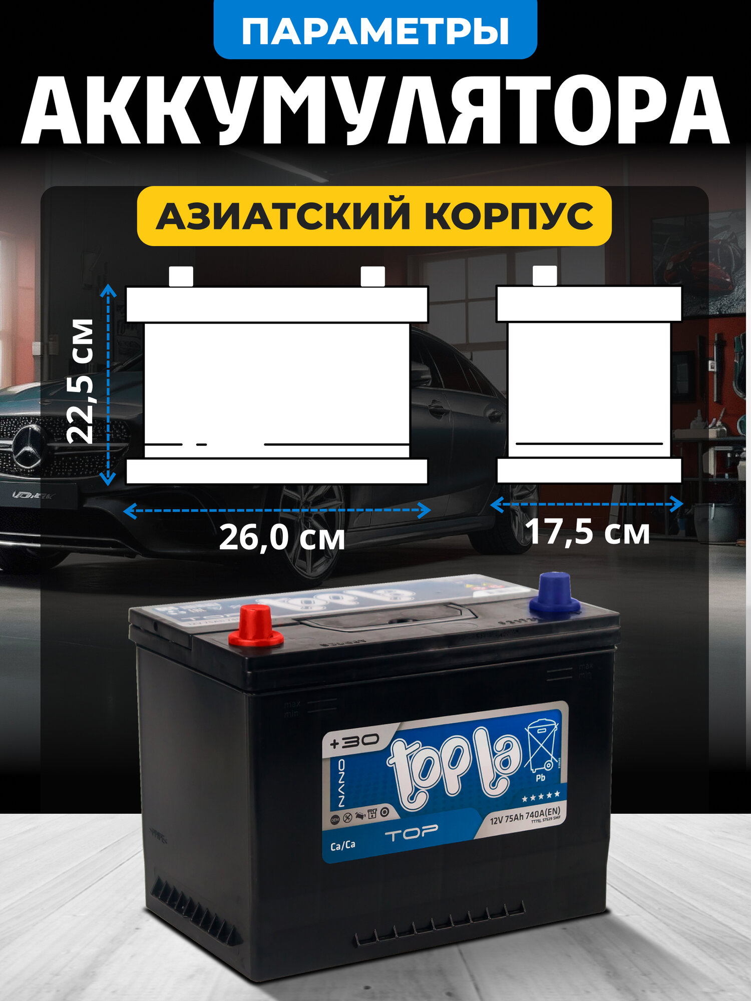 Аккумулятор автомобильный TOPLA Top JIS 75 Ah 740 A (нижний борт) прямая полярность 260x175x225: сравнение цен, характеристики, фото, актуальное наличие и цены.