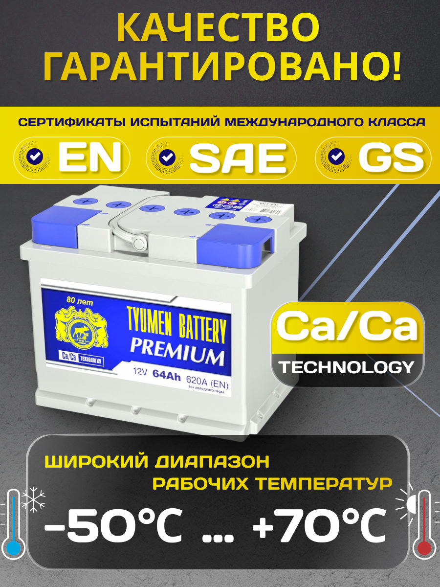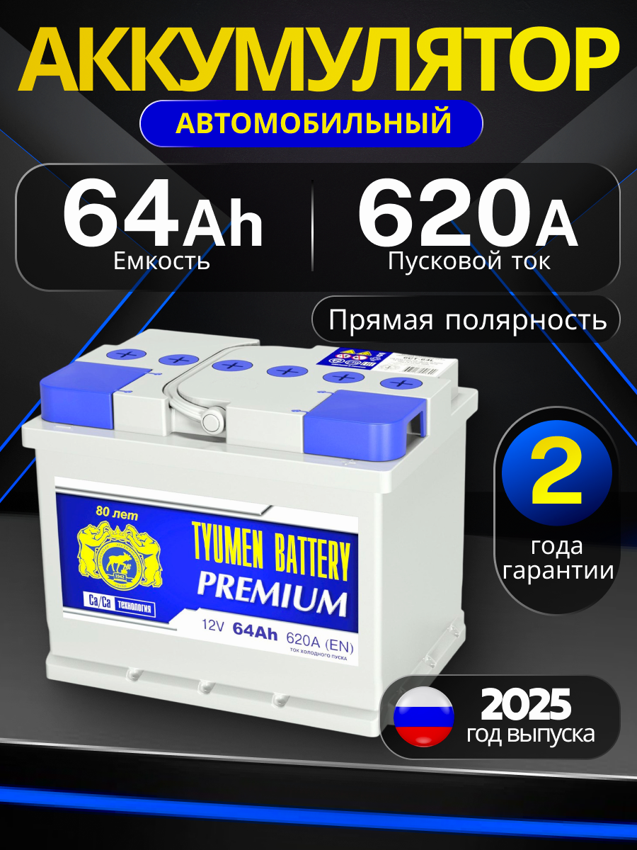 Аккумулятор автомобильный Тюмень Премиум 64Ah 620A прямая полярность (242x175x190): сравнение цен, характеристики, фото, актуальное наличие и цены.