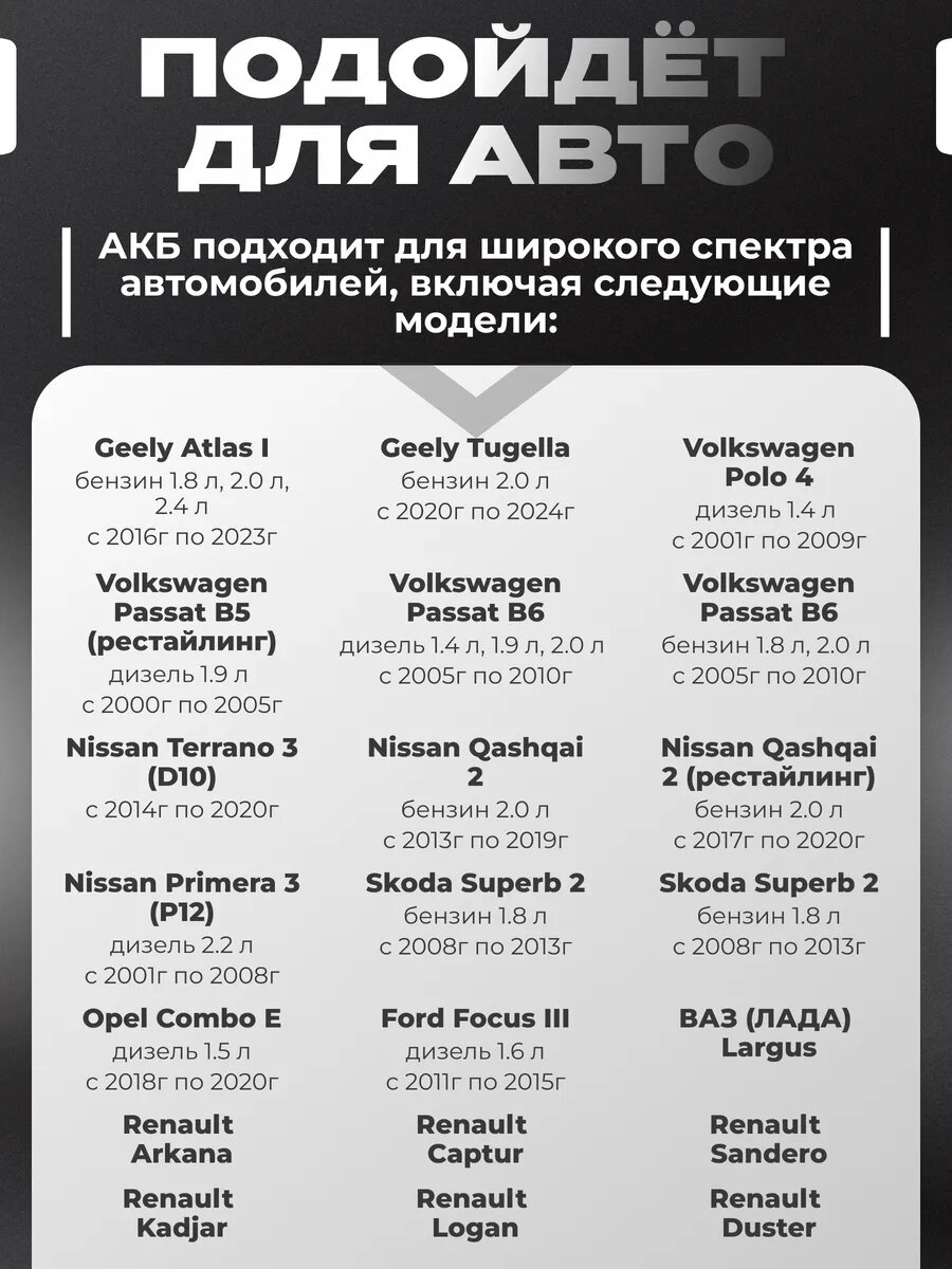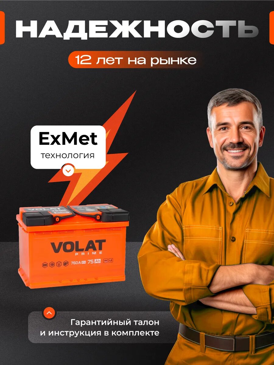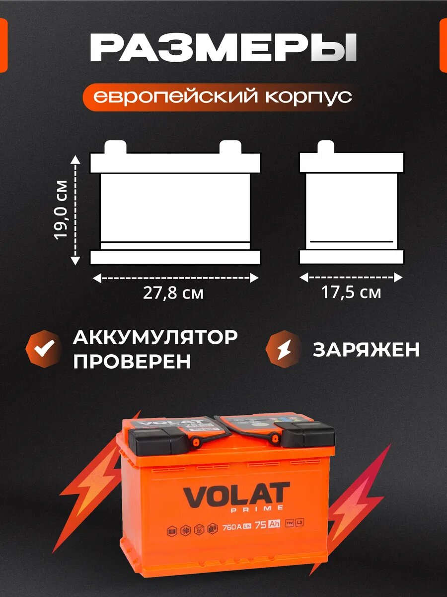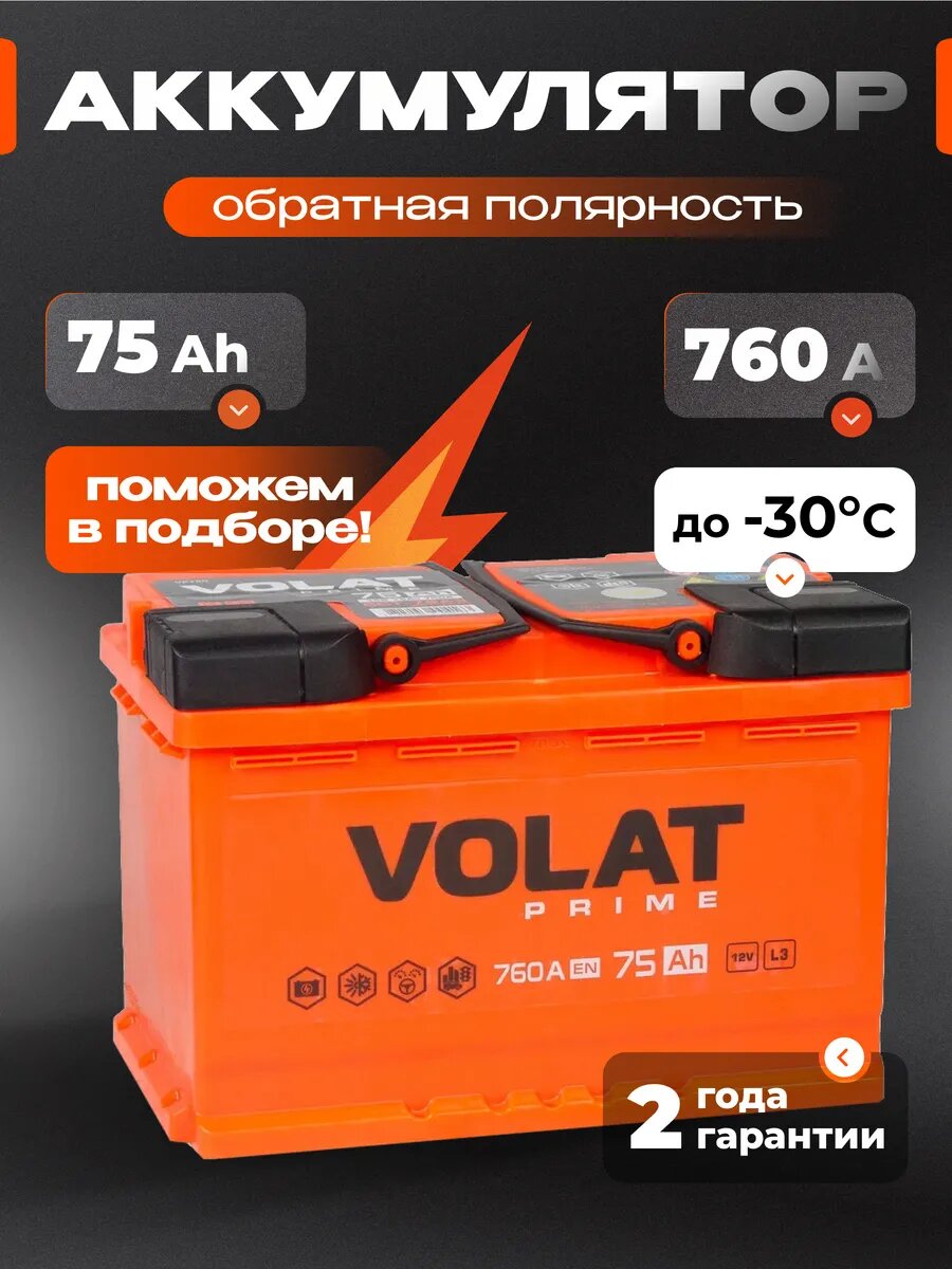 Линейка аккумуляторных батарей VOLAT рекомендована для легковых автомобилей большинства автопроизводителей. Серия аккумуляторов на автомобиль удачно сочетает в себе все необходимые эксплуатационные характеристики, в том числе хороший стартовый ток и повышенную виброустойчивость. При производстве аккумулятора машины использованы современные технологии и качественные комплектующие. Батареи аккумуляторные Волат имеет отличную пусковую мощность и производительность. При их производстве используется технология Expanded Metal (ExMet), обеспечивающая повышенный запас рабочего ресурса при интенсивной эксплуатации. Все эти характеристики дают железобетонное основание для философии и главного слогана этого бренда: VOLAT – надежен как танк! Аккумуляторы автомобильные 75 обратная полярность серии Volat Prime имеют ряд неоспоримых преимуществ: технологичность, надежность, увеличенный ресурс, производительность, функциональность, высокое качество. Увеличенное количество пластин авто аккумулятора позволяет уверенно запускать двигатель в любых погодных условиях. В качестве сепараторов для разделения положительных и отрицательных пластин использован специальный улучшенный материал, обладающий повышенной стойкостью к окислению и саморазрушению, что значительно увеличивает срок эксплуатации акб автомобильного 75. В аккумуляторе авто 12 вольт использована крышка Camina, имеющая технологические отверстия для обслуживания и удобные объемные ручки, что делает автобатарею невероятно простой в обслуживании. Корпус аккумулятора на машину изготавливается из ударопрочного пластика, стойкого к перепадам температур, воздействию электролита, масла и топлива. Срок службы аккумулятора на авто 12в кальциевого зависит от множества факторов, среди которых его характеристики и особенности использования. Перед заменой аккумулятора для автомобиля 70, следует внимательно прочесть сервисную книжку, там указаны рабочие параметры.