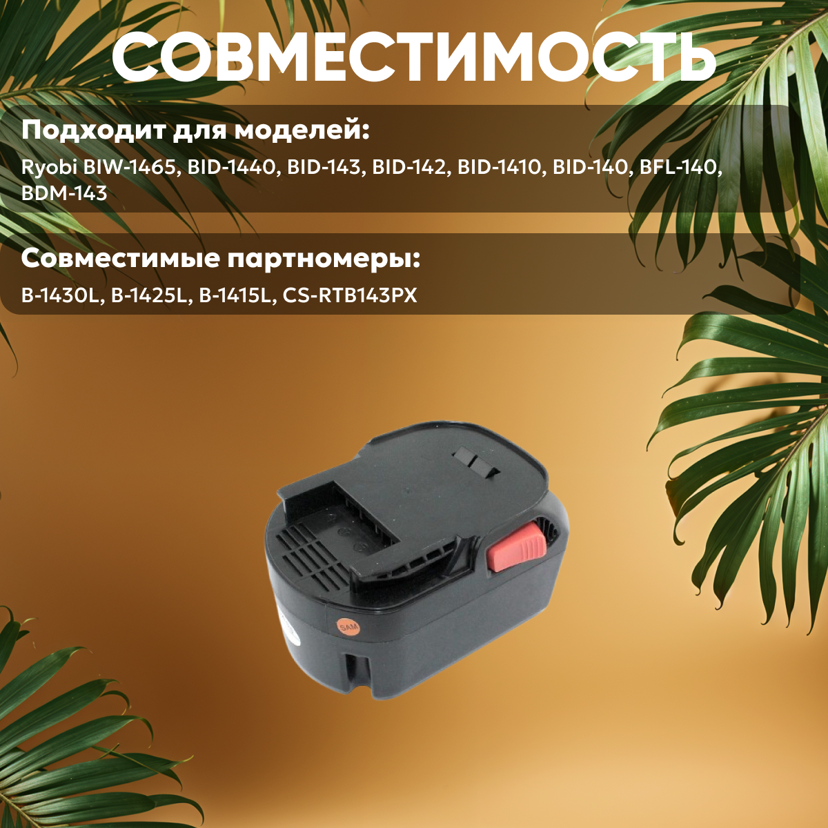 Аккумулятор B-1430L для электроинструмента Ryobi BIW-1465, BID-140, BFL-140, BDM-143, 4.0Ач, 14.4В, Li-Ion: сравнение цен, характеристики, фото, актуальное наличие и цены.
