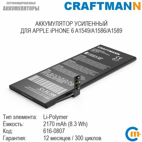 Купить Аккумулятор Craftmann 2170 мАч для APPLE iPHONE 6 A1549/A1586/A1589 (616-0807) с доставкой по всей России. Аккумулятор Craftmann 2170 мАч для APPLE iPHONE 6 A1549/A1586/A1589 (616-0807): сравнение цен, характеристики, фото, актуальное наличие и цены.