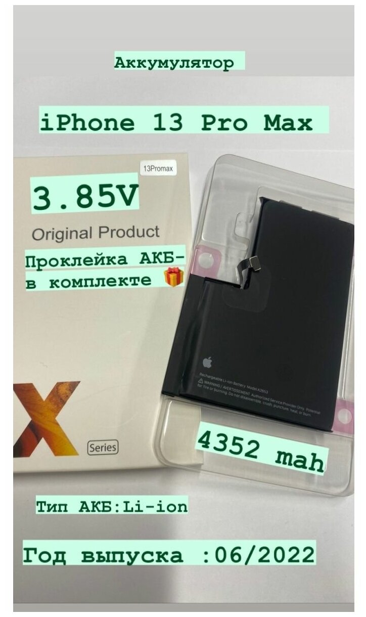 Аккумулятор для iPhone 13 Pro Max с оригинальным чипом . Емкость аккумулятора айфон 13 про макс-4352 mah. Год выпуска акб-06/2022. В комплекте есть проклейка акб. Для качественной замены аккумулятора айфон 13 про макс, рекомендуем обратиться в сервисный центр. Емкость батарейки в %-не будет отображаться у вас в настройках. Чтобы она отображалась, вам нужно обратиться в специализированный сервисный центр, где мастер может вам предложить эту услугу и с помощью специальных программаторов вернуть отображение аккумулятора в %. Для долгого срока службы акб, используйте только оригинальную зарядку. С ув. команда Original Parts.