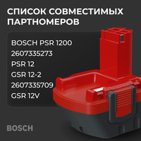 Не полный перечень совместимых партномеров и моделей батареи: PSR 1200 / 2607335273 / PSR 12 / GSR 12-2 / 2607335709 / GSR 12V / 2607335261 / 2607335262 / PSR 12-2 / PSR 12/2 / GSB 12 / 2607335541 / 2607335274 / 3360 / 2607335374 / 2607335463 / GSR 12 VE-2 / PSR 12VE / PSR 12 VE-2 / BAT120 / GSR 12-1 / GDR 12V / BAT043 / 2607335684 / BAT139 / 2607335676 / 2607335683 / 2607335531 / Exact 12 / GSB 12 VE-2 / 2607335542 / 2607335555 / 2607335692 / BAT045 / BAT046 / GLI 12 / 3360K / 3455 / 22612 / PSB 12 VE-2 / 2607335289 / Exact 8