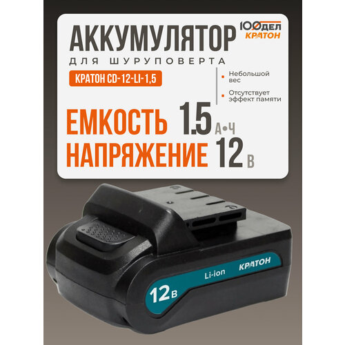 Аккумулятор предназначен для установки в дрель-шуруповерт Кратон CD-12-Li-1,5. Литий-ионная батарея выполнена в ударопрочном пластиковом корпусе, с креплениями под разъем электроинструмента. Модель наделена небольшим весом и эргономичной конструкцией, что дает возможность пользоваться дрелью без усталости рук. Емкости аккумулятора достаточно для продолжительной работы, при простое саморазряд составляет не более 3-5% в месяц. Надежная плотная сборка каждой составляющей детали обеспечивает продолжительную службу элементу питания.