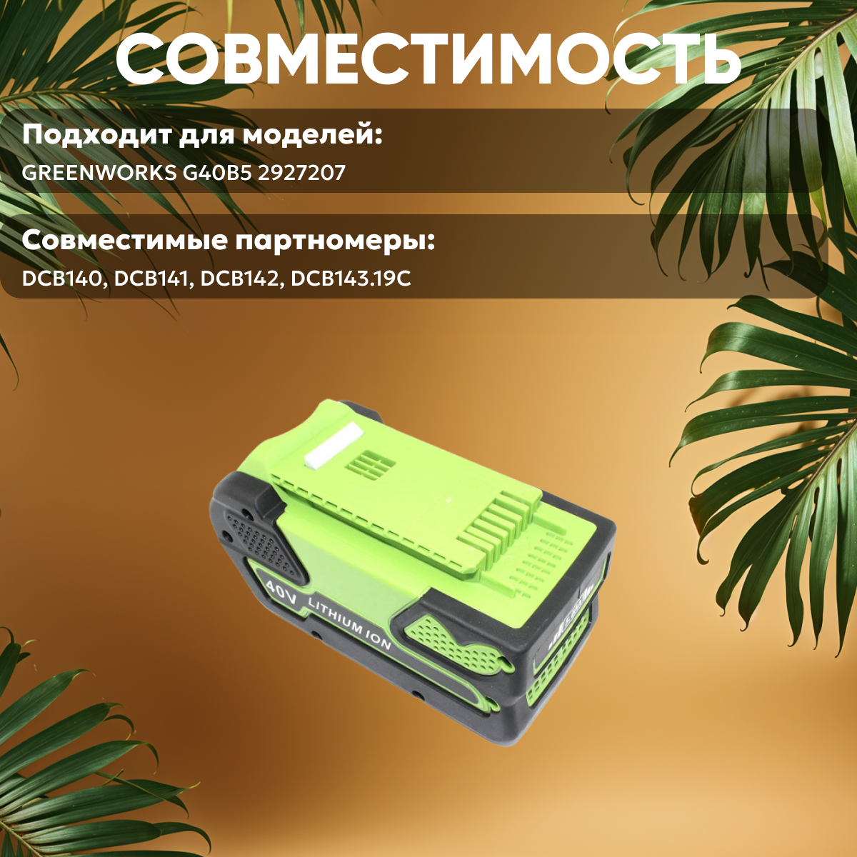 Аккумулятор для электроинструмента Greenworks G40B5, 2927207, 40В, 5Ач, 200Вт, Li-Ion, черно-зеленый: сравнение цен, характеристики, фото, актуальное наличие и цены.