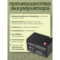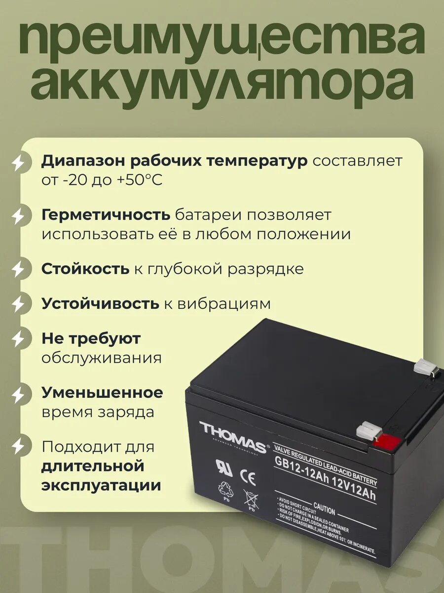 Аккумулятор для ибп THOMAS GB AGM 12v 12ah – устройство, предназначенное для обеспечения стабильного электропитания при отключении основного источника энергии. Бесперебойник для дома, компьютера играет важную роль в защите оборудования от потерь данных и повреждений, вызванных внезапными сбоями электроснабжения. Одним из лидеров на рынке стационарных аккумуляторов 12 вольт является серия Thomas, гарантирующая надежность и эффективность в работе источников бесперебойного питания. В аккумуляторе AGM 12В электролит абсорбирован в стекловолоконном сепараторе, что обеспечивает герметичность, устойчивость к вибрациям и низкое электрическое сопротивление. Они отличаются высокой стойкостью к глубокому разряду, большим количеством циклов перезаряда, прочным корпусом. Аккумуляторы для детской машины, мотоцикла, электромобиля являются безопасными для человека и окружающей среды, поскольку не выделяют вредных паров и не подвержены вытеканию электролита. Еще одно преимущество аккумуляторов для машинки на радиоуправлении – их можно монтировать в произвольном положении под наклоном, даже в перевернутом состоянии. Аккумуляторы для бесперебойника не требуют обслуживания, рекомендованы для использования как в буферном, так и циклическом режимах. Акб для источников резервного питания являются универсальными: пк, компьютеры, аварийное освещение, телекоммуникации, связь, промышленные установки, электропастухи, эхолоты 12v, фонари, фонарики, весы, опрыскиватели садовые умница, осветительные и переносные приборы, солнечные панели и батареи. Регулярно проверяйте состояние и уровень заряда акб для ибп. В нашем магазине можно приобрести подходящее зарядное устройство. Перед покупкой уточните рабочие параметры ранее установленной свинцово-кислотной батареи.