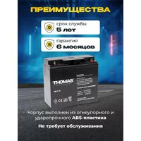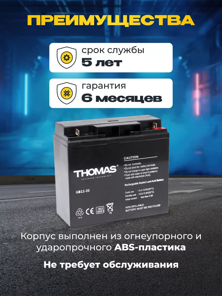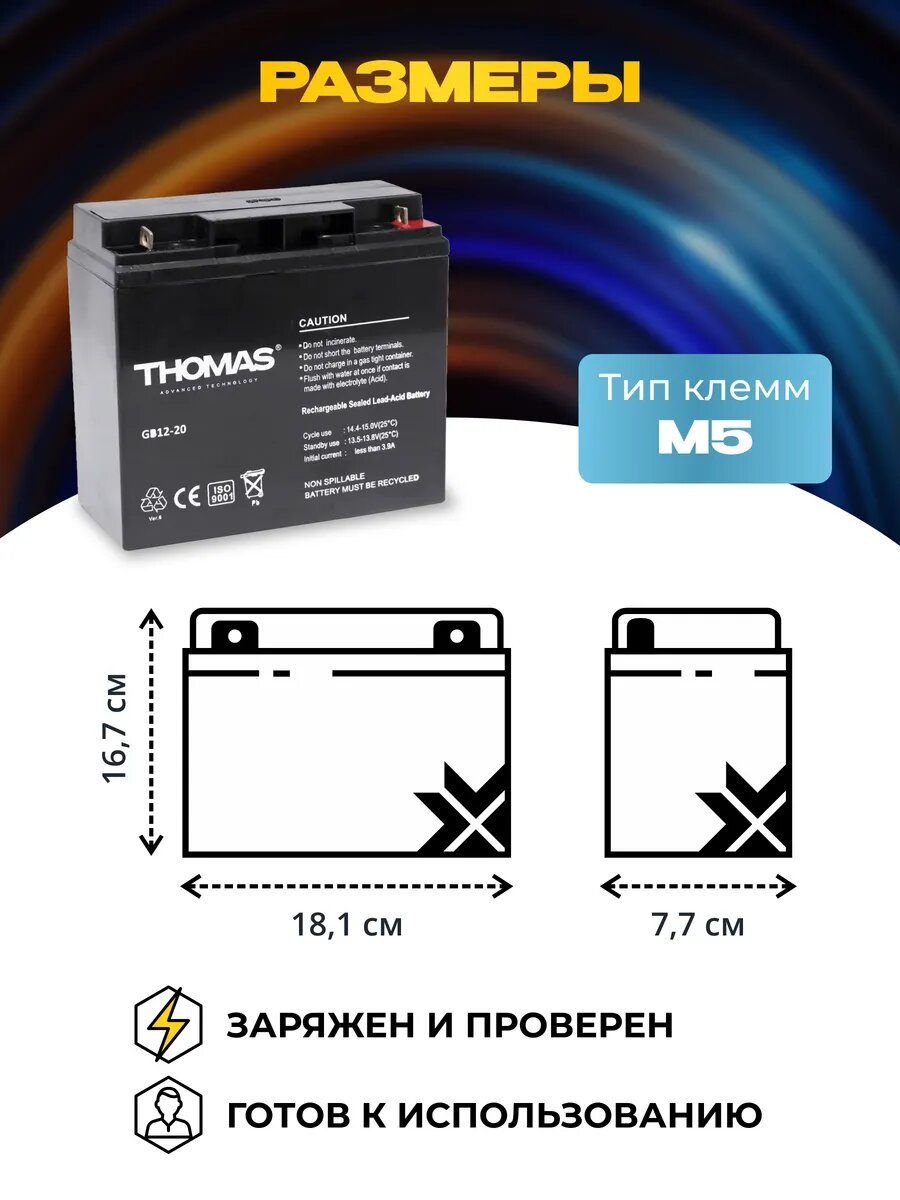 Аккумулятор для ибп THOMAS GB AGM 12v 20ah – устройство, предназначенное для обеспечения стабильного электропитания при отключении основного источника энергии. Бесперебойник для дома, компьютера играет важную роль в защите оборудования от потерь данных и повреждений, вызванных внезапными сбоями электроснабжения. Одним из лидеров на рынке стационарных аккумуляторов 12 вольт является серия Thomas, гарантирующая надежность и эффективность в работе источников бесперебойного питания. В аккумуляторе AGM 12В электролит абсорбирован в стекловолоконном сепараторе, что обеспечивает герметичность, устойчивость к вибрациям и низкое электрическое сопротивление. Они отличаются высокой стойкостью к глубокому разряду, большим количеством циклов перезаряда, прочным корпусом. Аккумуляторы для детской машины, мотоцикла, электромобиля являются безопасными для человека и окружающей среды, поскольку не выделяют вредных паров и не подвержены вытеканию электролита. Еще одно преимущество аккумуляторов для машинки на радиоуправлении – их можно монтировать в произвольном положении под наклоном, даже в перевернутом состоянии. Аккумуляторы для бесперебойника не требуют обслуживания, рекомендованы для использования как в буферном, так и циклическом режимах. Акб для источников резервного питания являются универсальными: пк, компьютеры, газовые и электро котлы отопления, аварийное освещение, системы видеонаблюдения, охранная пожарная сигнализация, извещатель, телекоммуникации, связь, промышленные установки, электропастухи, эхолоты 12v, опрыскиватели садовые умница, осветительные и переносные приборы, солнечные панели и батареи. Регулярно проверяйте состояние и уровень заряда акб для ибп. В нашем магазине можно приобрести подходящее зарядное устройство. Перед покупкой уточните рабочие параметры ранее установленной свинцово-кислотной батареи.