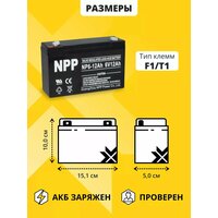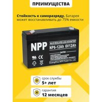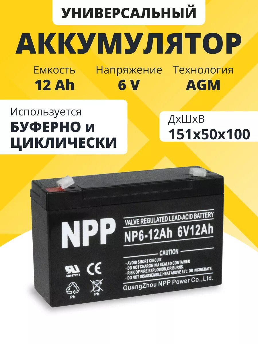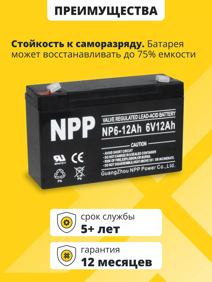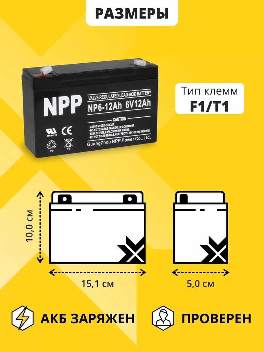 Аккумулятор для ибп NPP AGM 6v 12ah – устройство, предназначенное для обеспечения стабильного электропитания при отключении основного источника энергии. Бесперебойник для дома, компьютера играет важную роль в защите оборудования от потерь данных и повреждений, вызванных внезапными сбоями электроснабжения. Одним из лидеров на рынке стационарных аккумуляторов 6 вольт является серия NPP, гарантирующая надежность и эффективность в работе источников бесперебойного питания. В аккумуляторе AGM 6В электролит абсорбирован в стекловолоконном сепараторе, что обеспечивает герметичность, устойчивость к вибрациям и низкое электрическое сопротивление. Они отличаются высокой стойкостью к глубокому разряду, большим количеством циклов перезаряда, прочным корпусом. Аккумуляторы для детской машины, мотоцикла, электромобиля являются безопасными для человека и окружающей среды, поскольку не выделяют вредных паров и не подвержены вытеканию электролита. Еще одно преимущество аккумуляторов для машинки на радиоуправлении – их можно монтировать в произвольном положении под наклоном, даже в перевернутом состоянии. Аккумуляторы для бесперебойника не требуют обслуживания, рекомендованы для использования как в буферном, так и циклическом режимах. Акб для источников резервного питания являются универсальными: кассовые аппараты, кассы, медицинское, торговое оборудование, пк, компьютеры, телекоммуникации, связь, промышленные установки, эхолоты, детские машинки, скутеры, квадроциклы, электромашины, игрушки для ребенка, фонари, фонарики, весы, опрыскиватели садовые умница, осветительные и переносные приборы, солнечные панели и батареи. Регулярно проверяйте состояние и уровень заряда акб для ибп. В нашем магазине можно приобрести подходящее зарядное устройство. Перед покупкой уточните рабочие параметры ранее установленной свинцово-кислотной батареи.