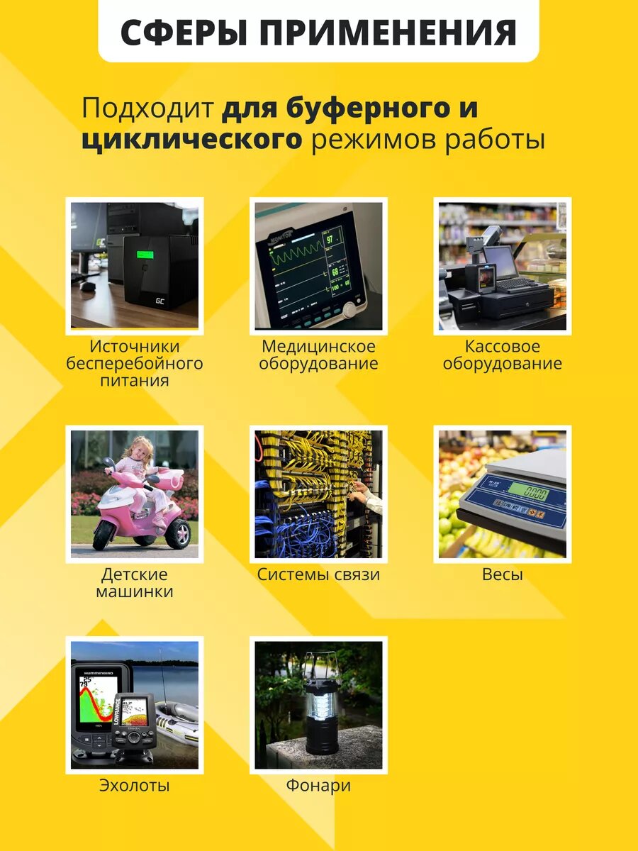 источники бесперебойного питания, источники резервного питания, медицинское оборудование, компьютеры, газовые и электрокотлы, котлы отопления, системы аварийного освещения, системы видеонаблюдения, охранная и пожарная сигнализация, системы связи и мини-АТС, насосы, детские электромобили, машины, мотоциклы, квадроциклы, радиоуправляемые машинки, инвалидные коляски, осветительное оборудование, солнечные панели и батареи, опрыскиватели, переносные приборы