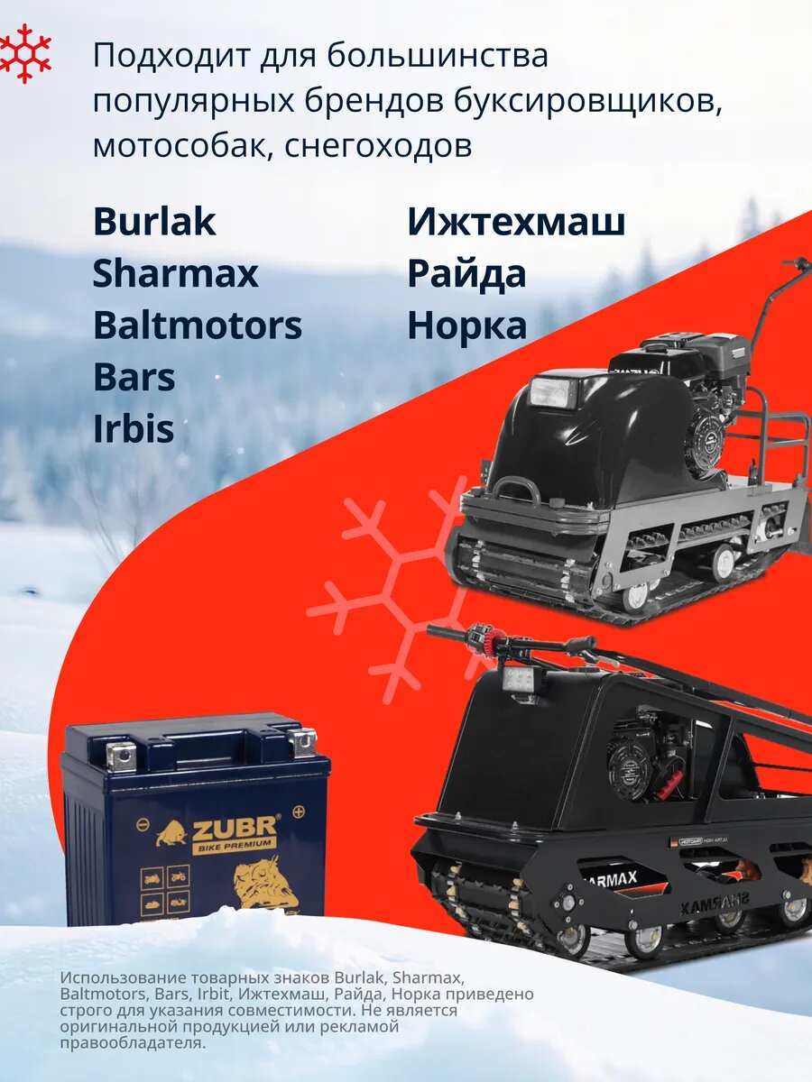 Аккумулятор для мотобуксировщика Burlak, Sharmax, Baltmotors, Bars, Irbis, Ижтехмаш, Райда, Норка быстро заряжается и не боится глубокого разряда, устойчив к воздействию низких и высоких температур. Мото запчасти и аксессуары эндуро мужские имеют повышенный пусковой ток и срок службы более пяти лет.