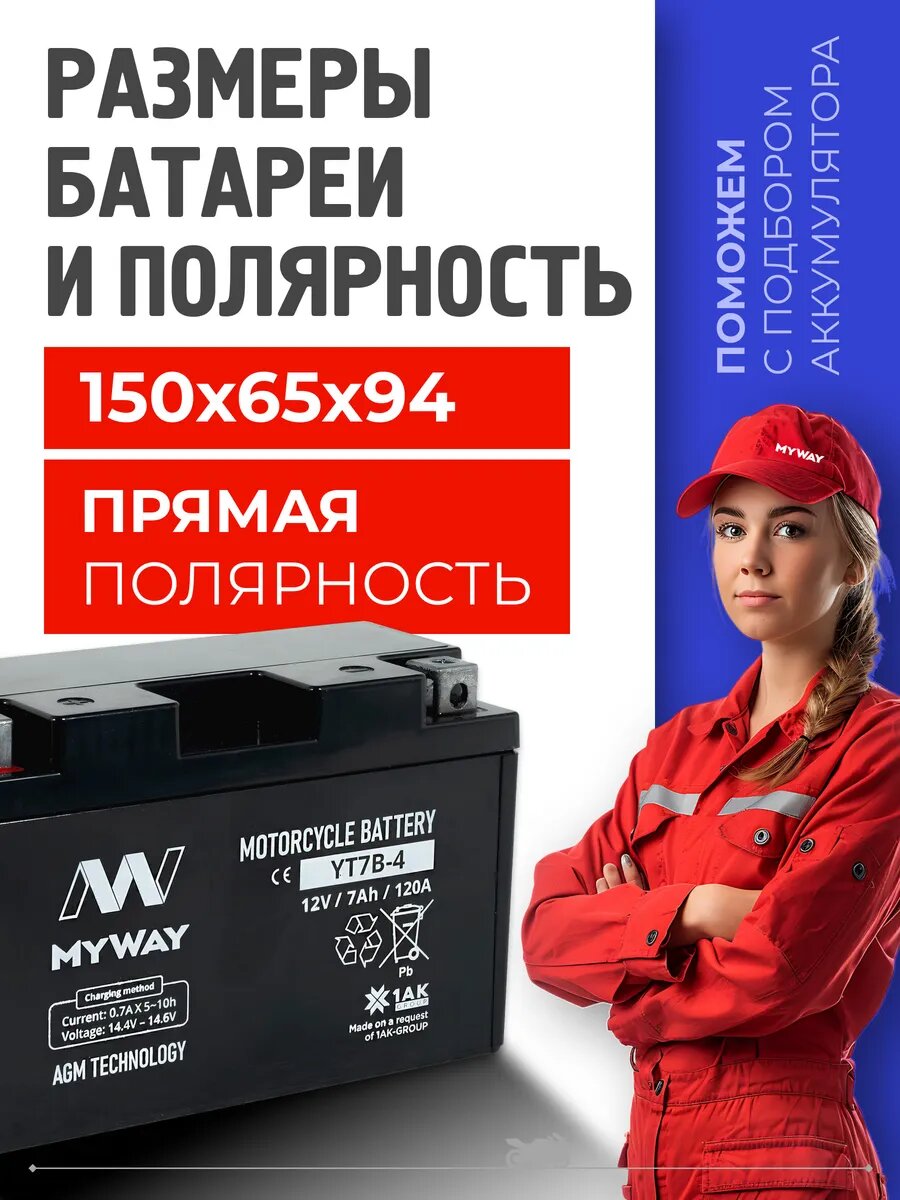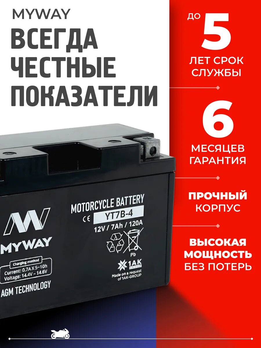 Мото аккумулятор 12 вольт 7 ампер MYWAY YT7B-4 AGM обеспечивает длительный срок службы и превосходную производительность даже в самых экстремальных условиях. Правильно подобранный акб мотоцикла 12в 7ач – гарантия длительной поездки и нормального запуска ДВС.