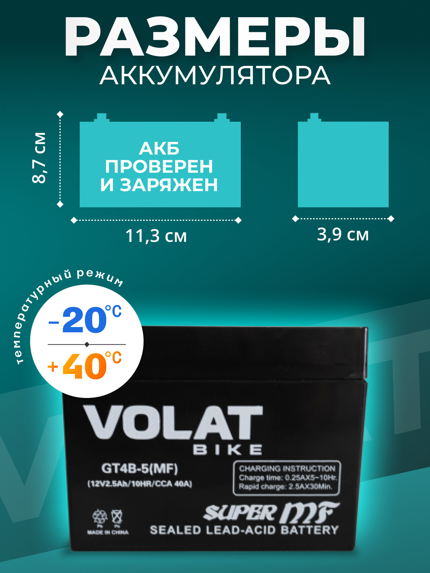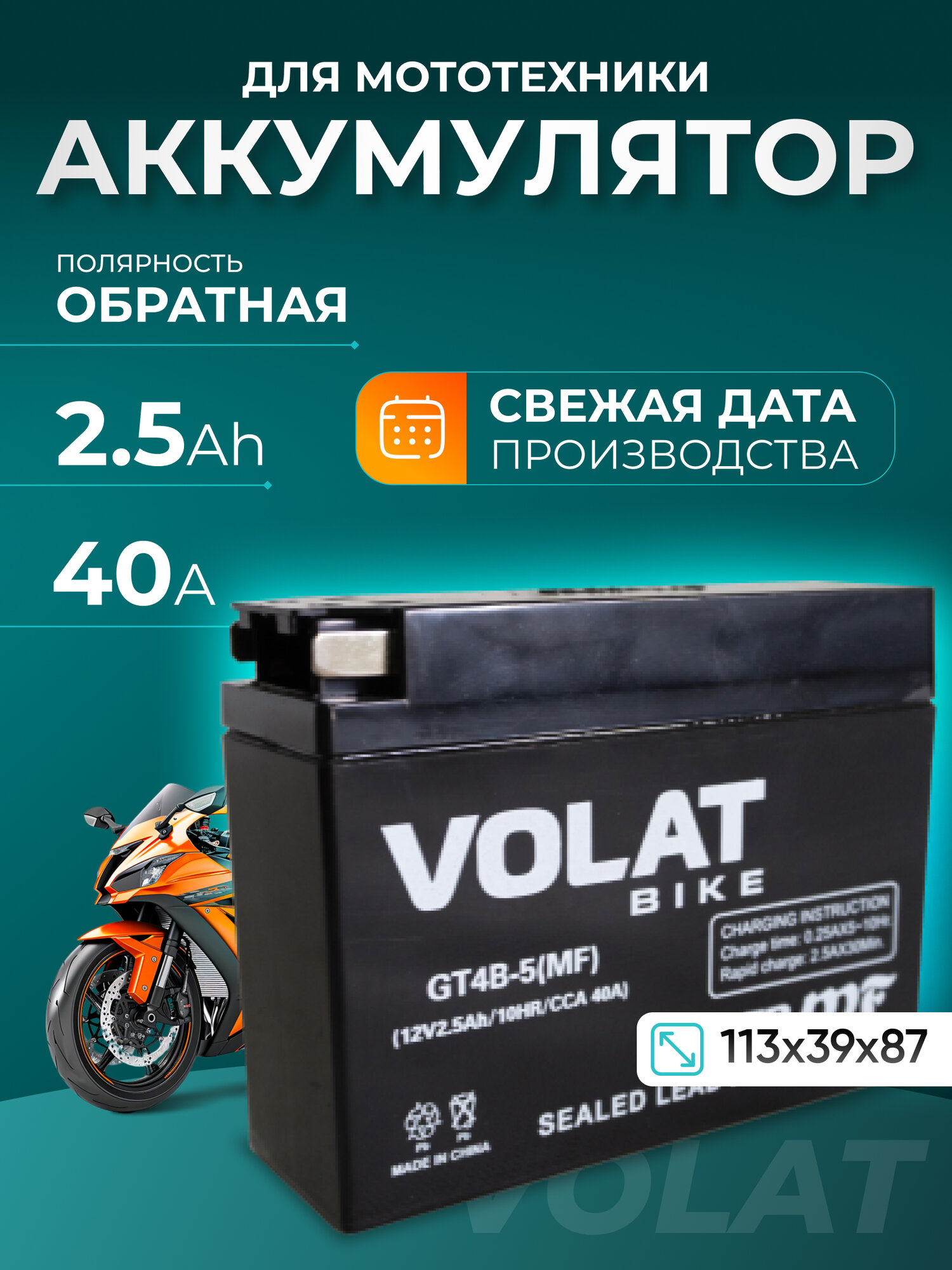 Купить Аккумулятор для мотоцикла 12v Volat GT4B-5(MF) обратная полярность 2.5 Ah 40 A AGM, акб на скутер, мопед, квадроцикл, мотоцикл с доставкой по всей России.