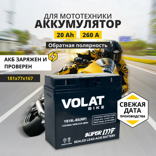 Мото аккумулятор 20 ач VOLAT YB19L-BS(MF) (оем номера СТ 1220.1; SMT 12-19; YT19BL-BS) гарантирует длительный срок службы и превосходную производительность даже в самых экстремальных условиях. Для того, чтобы получить истинное удовольствие от скорости и качества езды, у мотоцикла должен быть не только мощный двигатель, но также и надежный аккумулятор. Правильно подобранный акб на мотоцикл – гарантия длительной поездки и нормального запуска ДВС. Линейка аккумуляторных батарей VOLAT отличается высокой герметичностью и вибростойкостью, имеет прочный корпус из ударостойкого пластика. Долговечность и высокая энергоемкость аккумулятора мотоциклетного 12v гарантируют долгую бесперебойную работу мотобайка. Аккумуляторы для мотоцикла 12в обладают высокой стартовой мощностью и повышенной энергоотдачей, являются универсальными, подходят для пуска двигателей мототехники: мотоцикл альфа, урал, электро мопед, иж планета юпитер, скутер электрический китайский японский, гидроцикл, квадроцикл, снегоход, снегоуборщик, снегоочиститель, багги, мотовездеход, питбайк 125, пит байк, трицикл, электротрицикл, мотособака, мотобуксировщик, снегоуборщик, бензогенератор, генератор и др. Аккумулятор мото 12 вольт на альфу AGM отличается стойкостью к глубокому разряду и воздействию низких температур, является необслуживаемым. Мото аксессуары эндуро мужские имеют высокий показатель пускового тока и срок службы более пяти лет. Основные преимущества аккумулятора для мопеда альфа: полностью герметичная конструкция, не допускающая утечку электролита; система внутренней рекомбинации газа акб для скутера 12 в исключает необходимость долива дистиллята; повышенные стартовые характеристики; компактность; высокая устойчивость к циклированию, вибрациям при любом стиле езды; адаптированы к российским дорогам и климату. Перед покупкой мототовара узнайте размеры посадочного места. Мотоаккумулятор Волат прост в установке, может работать в любом положении и позволяет быть уверенным в надежном запуске.