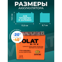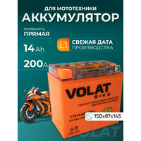 Мото аккумулятор 14 ач VOLAT YTX14-BS(GEL) (оем номера СТ 1214; YTX14-BS; MT 12-14; SMT 12-14; EB14C-4) гарантирует длительный срок службы и превосходную производительность даже в самых экстремальных условиях. Для того, чтобы получить истинное удовольствие от скорости и качества езды, у мотоцикла должен быть не только мощный двигатель, но также и надежный аккумулятор. Правильно подобранный акб на мотоцикл – гарантия длительной поездки и нормального запуска ДВС. Линейка аккумуляторных батарей VOLAT отличается высокой герметичностью и вибростойкостью, имеет прочный корпус из ударостойкого пластика. Долговечность и высокая энергоемкость аккумулятора мотоциклетного 12v гарантируют долгую бесперебойную работу мотобайка. Аккумуляторы для мотоцикла гелевые 12в обладают высокой стартовой мощностью и повышенной энергоотдачей, являются универсальными, подходят для пуска двигателей мототехники: мотоцикл альфа, урал, электро мопед, иж планета юпитер, скутер электрический японский, гидроцикл, квадроцикл, снегоход, снегоуборщик, снегоочиститель, багги, мотовездеход, питбайк 125, пит байк, трицикл, электротрицикл, мотособака, мотобуксировщик, снегоуборщик, бензогенератор, генератор. Аккумулятор мото 12 вольт на альфу GEL отличается стойкостью к глубокому разряду и воздействию низких температур, является необслуживаемым. Мото аксессуары эндуро мужские имеют высокий показатель пускового тока и срок службы более пяти лет. Основные преимущества аккумулятора для мопеда альфа: полностью герметичная конструкция, не допускающая утечку электролита; система внутренней рекомбинации газа акб для скутера 12 в исключает необходимость долива дистиллята; повышенные стартовые характеристики; компактность; высокая устойчивость к циклированию, вибрациям при любом стиле езды; адаптированы к российским дорогам и климату. Перед покупкой мототовара узнайте размеры посадочного места. Мотоаккумулятор Волат прост в установке, может работать в любом положении и позволяет быть уверенным в надежном запуске.