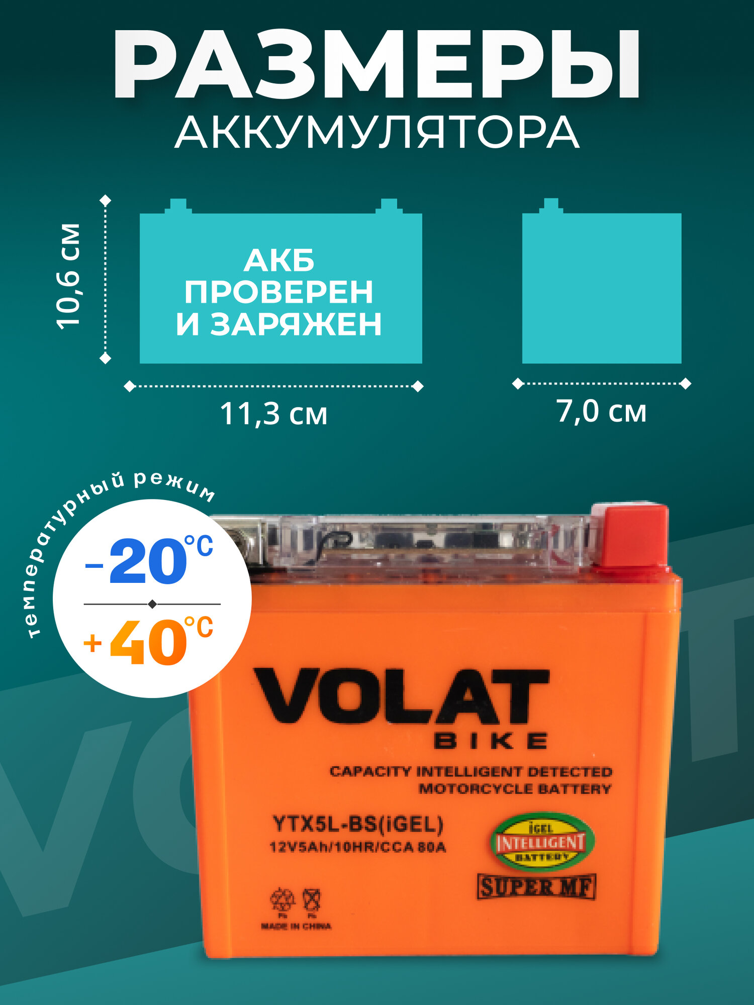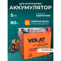 Мото аккумулятор 5 ач VOLAT YTX5L-BS(iGEL) (оем номера СТ 1205; YTX5L-BS; MT 12-5; SMT 12-5; YTX5L-BS-Gel; EB5-3 YTX5L) гарантирует длительный срок службы и превосходную производительность даже в самых экстремальных условиях. Для того, чтобы получить истинное удовольствие от скорости и качества езды, у мотоцикла должен быть не только мощный двигатель, но также и надежный аккумулятор. Правильно подобранный акб на мотоцикл – гарантия длительной поездки и нормального запуска ДВС. Линейка аккумуляторных батарей VOLAT отличается высокой герметичностью и вибростойкостью, имеет прочный корпус из ударостойкого пластика. Долговечность и высокая энергоемкость аккумулятора мотоциклетного 12v гарантируют долгую бесперебойную работу мотобайка. Аккумуляторы для мотоцикла гелевые 12в обладают высокой стартовой мощностью и повышенной энергоотдачей, являются универсальными, подходят для пуска двигателей мототехники: мотоцикл альфа, урал, электро мопед, иж планета юпитер, скутер электрический японский, гидроцикл, квадроцикл, снегоход, снегоуборщик, снегоочиститель, багги, мотовездеход, питбайк 125, пит байк, трицикл, электротрицикл, мотособака, мотобуксировщик, снегоуборщик, бензогенератор, генератор. Аккумулятор мото 12 вольт на альфу GEL отличается стойкостью к глубокому разряду и воздействию низких температур, является необслуживаемым. Мото аксессуары эндуро мужские имеют высокий показатель пускового тока и срок службы более пяти лет. Основные преимущества аккумулятора для мопеда альфа: полностью герметичная конструкция, не допускающая утечку электролита; система внутренней рекомбинации газа акб для скутера 12 в исключает необходимость долива дистиллята; повышенные стартовые характеристики; высокая устойчивость к циклированию, вибрациям при любом стиле езды; адаптированы к российским дорогам и климату. Перед покупкой мототовара узнайте размеры посадочного места. Мотоаккумулятор Волат прост в установке, может работать в любом положении и позволяет быть уверенным в надежном запуске.