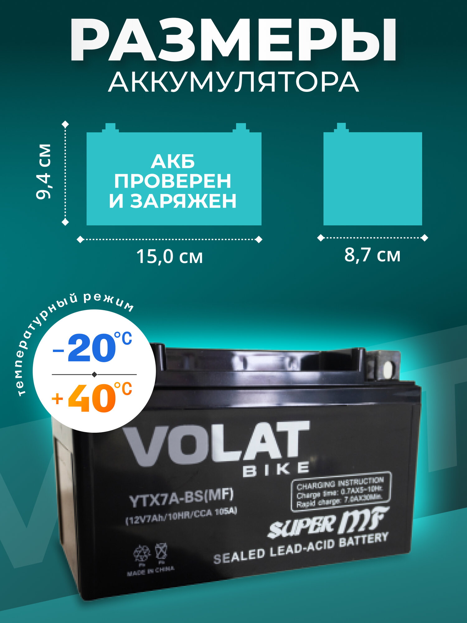 Аккумулятор для мотоцикла 12v Volat YTX7A-BS(MF) прямая полярность 7 Ah 105 A AGM, акб на скутер, мопед, квадроцикл, мотоцикл: сравнение цен, характеристики, фото, актуальное наличие и цены.