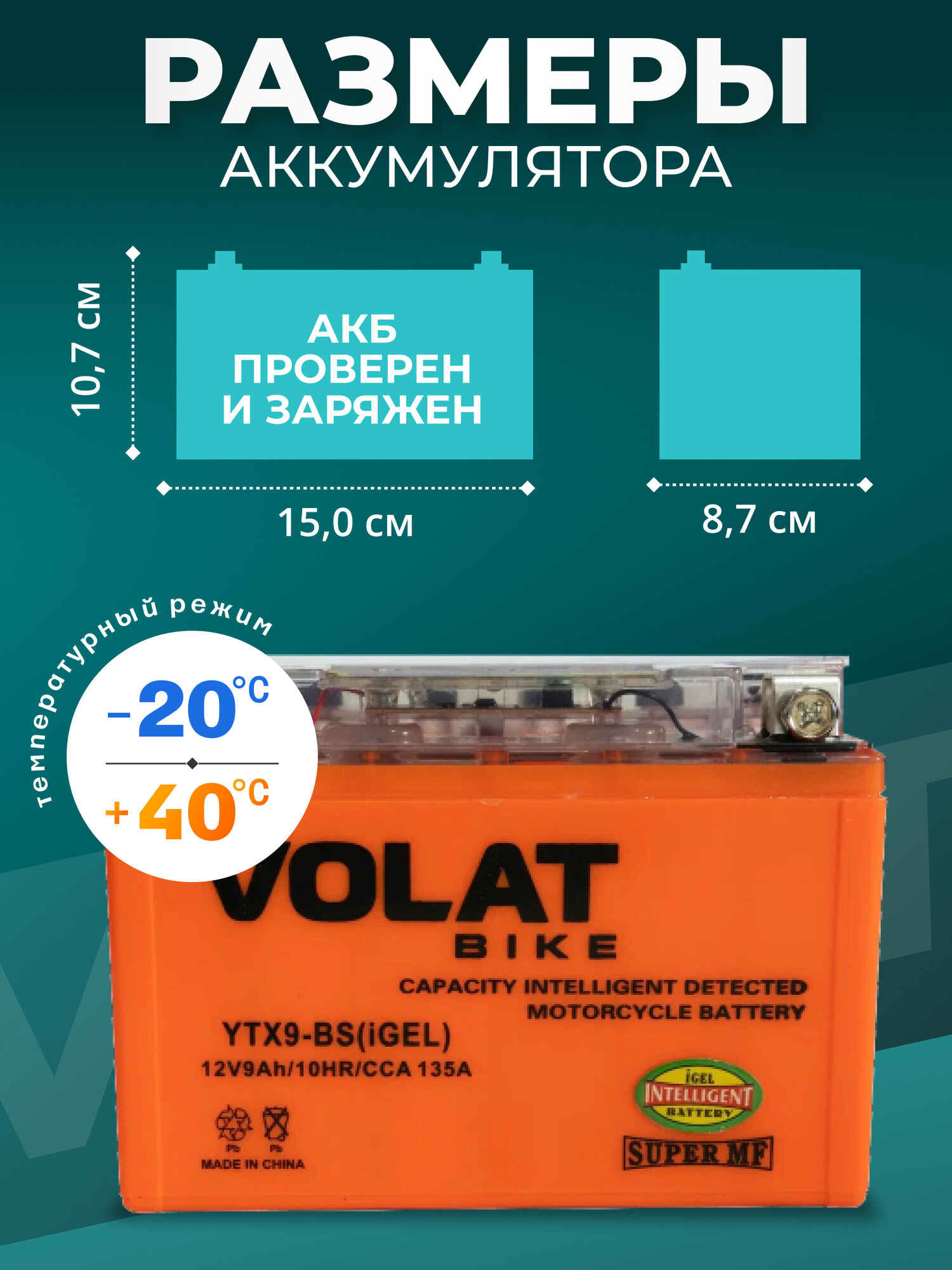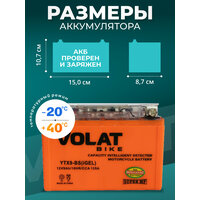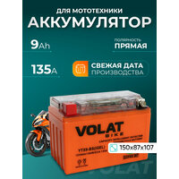 Мото аккумулятор 9 ач VOLAT YTX9-BS(GEL) (номера СТ 1209 YTX9-BS MT 12-9 SMT 12-9 YTX9-BS-Gel EB9-4 MX9-4 CTX9-BS PTX9-BS) гарантирует длительный срок службы и превосходную производительность даже в самых экстремальных условиях. Для того, чтобы получить истинное удовольствие от скорости и качества езды, у мотоцикла должен быть не только мощный двигатель, но также и надежный аккумулятор. Правильно подобранный акб на мотоцикл – гарантия длительной поездки и нормального запуска ДВС. Линейка аккумуляторных батарей VOLAT отличается высокой герметичностью и вибростойкостью, имеет прочный корпус из ударостойкого пластика. Долговечность и высокая энергоемкость аккумулятора мотоциклетного 12v гарантируют долгую бесперебойную работу мотобайка. Аккумуляторы для мотоцикла гелевые 12в обладают высокой стартовой мощностью и повышенной энергоотдачей, являются универсальными, подходят для пуска двигателей мототехники: мотоцикл альфа, урал, электро мопед, иж планета юпитер, скутер электрический, гидроцикл, квадроцикл, снегоход, снегоуборщик, снегоочиститель, багги, мотовездеход, питбайк 125, пит байк, трицикл, электротрицикл, мотособака, мотобуксировщик, снегоуборщик, бензогенератор, генератор и др. Аккумулятор мото 12 вольт на альфу GEL отличается стойкостью к глубокому разряду и воздействию низких температур, является необслуживаемым. Мото аксессуары эндуро мужские имеют высокий показатель пускового тока и срок службы более пяти лет. Основные преимущества аккумулятора для мопеда альфа: полностью герметичная конструкция, не допускающая утечку электролита; система внутренней рекомбинации газа акб для скутера 12 в исключает необходимость долива дистиллята; повышенные стартовые характеристики; высокая устойчивость к циклированию, вибрациям при любом стиле езды; адаптированы к российским дорогам и климату. Перед покупкой мототовара узнайте размеры посадочного места. Мотоаккумулятор Волат прост в установке, может работать в любом положении и позволяет быть уверенным в надежном запуске.