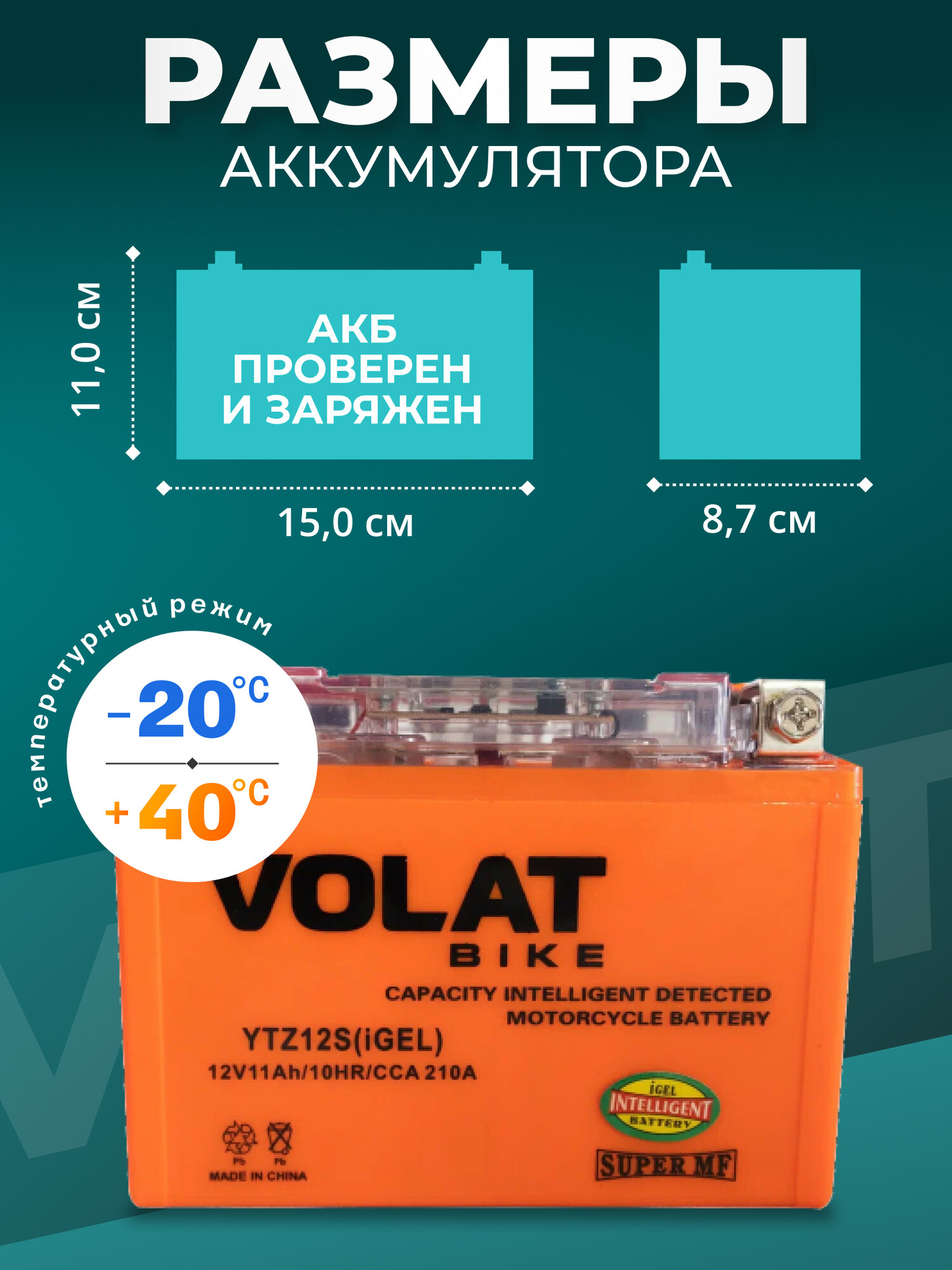 Мото аккумулятор 11 ач VOLAT YTZ12S(iGEL) (оем номера СТ 1211; YTZ12S-BS; MT 12-11; SMT 12-11 EBZ12-4 YTZ12S) гарантирует длительный срок службы и превосходную производительность даже в самых экстремальных условиях. Для того, чтобы получить истинное удовольствие от скорости и качества езды, у мотоцикла должен быть не только мощный двигатель, но также и надежный аккумулятор. Правильно подобранный акб на мотоцикл – гарантия длительной поездки и нормального запуска ДВС. Линейка аккумуляторных батарей VOLAT отличается высокой герметичностью и вибростойкостью, имеет прочный корпус из ударостойкого пластика. Долговечность и высокая энергоемкость аккумулятора мотоциклетного 12v гарантируют долгую бесперебойную работу мотобайка. Аккумуляторы для мотоцикла гелевые 12в обладают высокой стартовой мощностью и повышенной энергоотдачей, являются универсальными, подходят для пуска двигателей мототехники: мотоцикл альфа, урал, электро мопед, иж планета юпитер, скутер электрический, гидроцикл, квадроцикл, снегоход, снегоуборщик, снегоочиститель, багги, мотовездеход, питбайк 125, пит байк, трицикл, электротрицикл, мотособака, мотобуксировщик, снегоуборщик, бензогенератор, генератор и др. Аккумулятор мото 12 вольт на альфу GEL отличается стойкостью к глубокому разряду и воздействию низких температур, является необслуживаемым. Мото аксессуары эндуро мужские имеют высокий показатель пускового тока и срок службы более пяти лет. Основные преимущества аккумулятора для мопеда альфа: полностью герметичная конструкция, не допускающая утечку электролита; система внутренней рекомбинации газа акб для скутера 12 в исключает необходимость долива дистиллята; повышенные стартовые характеристики; компактность; высокая устойчивость к циклированию, вибрациям при любом стиле езды; адаптированы к российским дорогам и климату. Перед покупкой мототовара узнайте размеры посадочного места. Мотоаккумулятор Волат прост в установке, может работать в любом положении и позволяет быть уверенным в надежном запуске.
