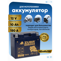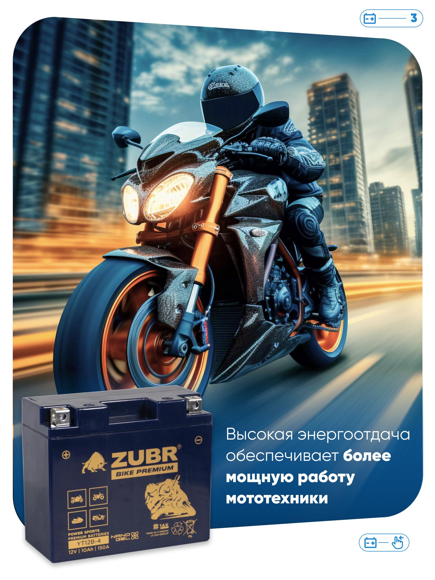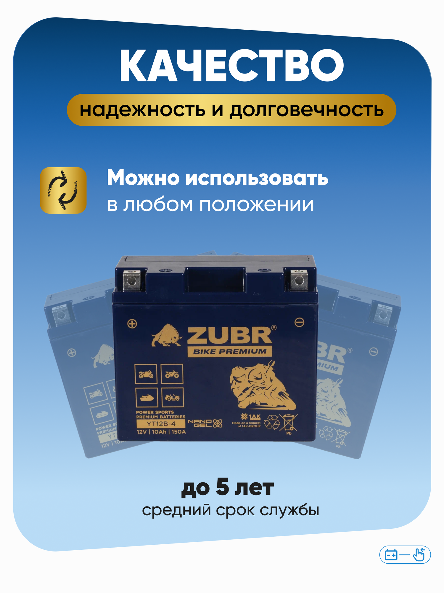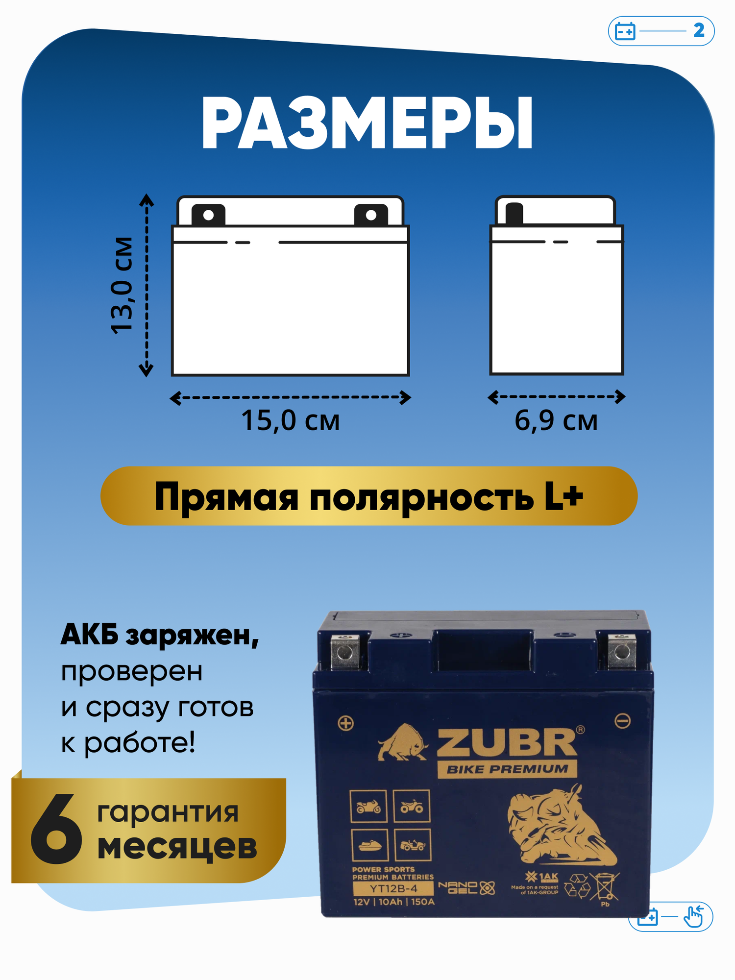 Мото аккумулятор 10 ач ZUBR PREMIUM YT12B-4(GEL) (оем номера СТ 1212.1; YT12B-BS YT12B-4-Gel EB12B-4) гарантирует длительный срок службы и превосходную производительность даже в самых экстремальных условиях. Для того, чтобы получить истинное удовольствие от скорости и качества езды, у мотоцикла должен быть не только мощный двигатель, но также и надежный аккумулятор. Правильно подобранный акб на мотоцикл – гарантия длительной поездки и нормального запуска ДВС. Линейка аккумуляторных батарей ZUBR отличается высокой герметичностью и вибростойкостью, имеет прочный корпус из ударостойкого пластика. Долговечность и высокая энергоемкость аккумулятора мотоциклетного 12v гарантируют долгую бесперебойную работу мотобайка. Аккумуляторы для мотоцикла гелевые 12в обладают высокой стартовой мощностью и повышенной энергоотдачей, являются универсальными, подходят для пуска двигателей мототехники: мотоцикл альфа, урал, электро мопед, иж планета юпитер, скутер электрический китайский, гидроцикл, квадроцикл, снегоход, снегоуборщик, снегоочиститель, багги, мотовездеход, питбайк 125, пит байк, трицикл, электротрицикл, мотособака, мотобуксировщик, снегоуборщик, бензогенератор, генератор и др. Аккумулятор мото 12 вольт на альфу GEL отличается стойкостью к глубокому разряду и воздействию низких температур, является необслуживаемым. Мото аксессуары эндуро мужские имеют высокий показатель пускового тока и срок службы более пяти лет. Основные преимущества аккумулятора для мопеда альфа: полностью герметичная конструкция, не допускающая утечку электролита; система внутренней рекомбинации газа акб для скутера 12 в исключает необходимость долива дистиллята; повышенные стартовые характеристики; компактность; высокая устойчивость к циклированию, вибрациям при любом стиле езды; адаптированы к российским дорогам и климату. Перед покупкой мототовара узнайте размеры посадочного места. Мотоаккумулятор Зубр прост в установке, может работать в любом положении и позволяет быть уверенным в надежном запуске.