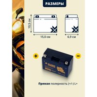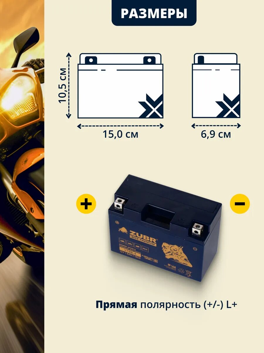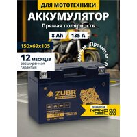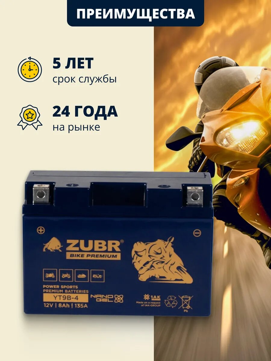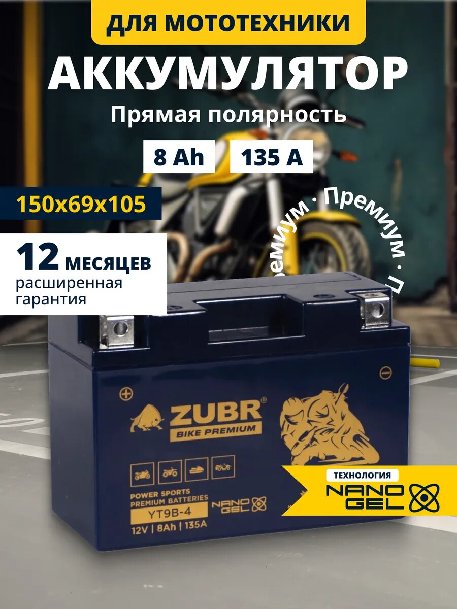 Мото аккумулятор 8 ач ZUBR PREMIUM YT9B-4(GEL) (оем номера СТ 1209.1; MT 12-9-A; SMT 12-9-A; YT9B-4-Gel; EB9B-4; YTX9-BS; YTX9) гарантирует длительный срок службы и превосходную производительность даже в самых экстремальных условиях. Для того, чтобы получить истинное удовольствие от скорости и качества езды, у мотоцикла должен быть не только мощный двигатель, но также и надежный аккумулятор. Правильно подобранный акб на мотоцикл – гарантия длительной поездки и нормального запуска ДВС. Линейка аккумуляторных батарей ZUBR отличается высокой герметичностью и вибростойкостью, имеет прочный корпус из ударостойкого пластика. Долговечность и высокая энергоемкость аккумулятора мотоциклетного 12v гарантируют долгую бесперебойную работу мотобайка. Аккумуляторы для мотоцикла гелевые 12в обладают высокой стартовой мощностью и повышенной энергоотдачей, являются универсальными, подходят для пуска двигателей мототехники: мотоцикл альфа, урал, электро мопед, иж планета юпитер, скутер электрический китайский, гидроцикл, квадроцикл, снегоход, снегоуборщик, снегоочиститель, багги, мотовездеход, питбайк 125, пит байк, трицикл, электротрицикл, мотособака, мотобуксировщик, снегоуборщик, бензо генератор. Аккумулятор мото 12 вольт на альфу GEL отличается стойкостью к глубокому разряду и воздействию низких температур, является необслуживаемым. Мото аксессуары эндуро мужские имеют высокий показатель пускового тока и срок службы более пяти лет. Основные преимущества аккумулятора для мопеда альфа: полностью герметичная конструкция, не допускающая утечку электролита; система внутренней рекомбинации газа акб для скутера 12 в исключает необходимость долива дистиллята; повышенные стартовые характеристики; высокая устойчивость к циклированию, вибрациям при любом стиле езды; адаптированы к российским дорогам и климату. Перед покупкой мототовара узнайте размеры посадочного места. Мотоаккумулятор Зубр прост в установке, может работать в любом положении и позволяет быть уверенным в надежном запуске.