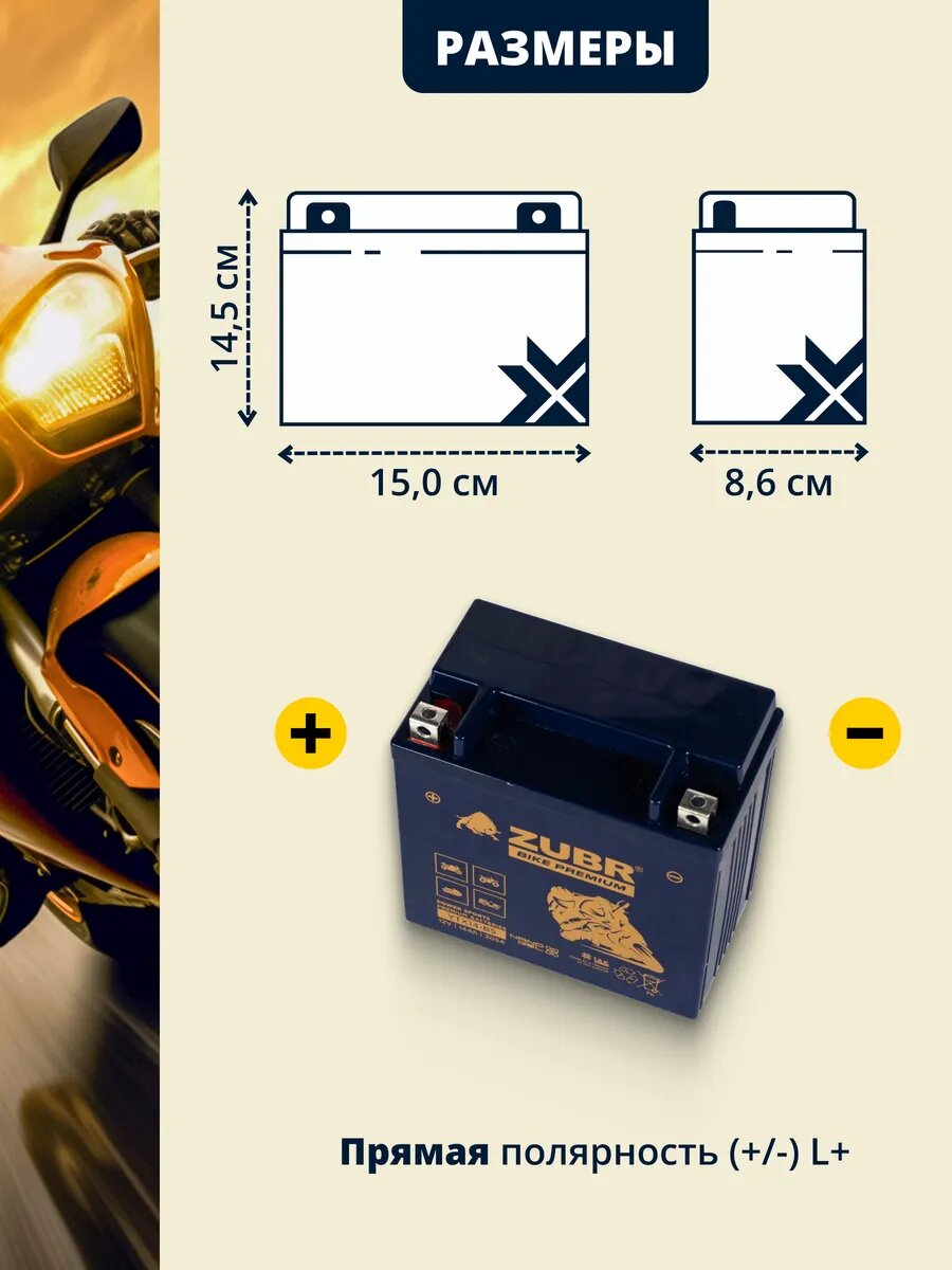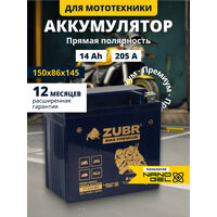 Мото аккумулятор 14 ач ZUBR PREMIUM YTX14-BS(GEL) (номера СТ 1214; YTX14-BS; MT 12-14; SMT 12-14; EB14C-4) гарантирует длительный срок службы и превосходную производительность даже в самых экстремальных условиях. Для того, чтобы получить истинное удовольствие от скорости и качества езды, у мотоцикла должен быть не только мощный двигатель, но также и надежный аккумулятор. Правильно подобранный акб на мотоцикл – гарантия длительной поездки и нормального запуска ДВС. Линейка аккумуляторных батарей ZUBR отличается высокой герметичностью и вибростойкостью, имеет прочный корпус из ударостойкого пластика. Долговечность и высокая энергоемкость аккумулятора мотоциклетного 12v гарантируют долгую бесперебойную работу мотобайка. Аккумуляторы для мотоцикла гелевые 12в обладают высокой стартовой мощностью и повышенной энергоотдачей, являются универсальными, подходят для пуска двигателей мототехники: мотоцикл альфа, урал, электро мопед, иж планета юпитер, скутер электрический китайский, гидроцикл, квадроцикл, снегоход, снегоуборщик, снегоочиститель, багги, мотовездеход, питбайк 125, пит байк, трицикл, электротрицикл, мотособака, мотобуксировщик, снегоуборщик, бензогенератор, генератор. Аккумулятор мото 12 вольт на альфу GEL отличается стойкостью к глубокому разряду и воздействию низких температур, является необслуживаемым. Мото аксессуары эндуро мужские имеют высокий показатель пускового тока и срок службы более пяти лет. Основные преимущества аккумулятора для мопеда альфа: полностью герметичная конструкция, не допускающая утечку электролита; система внутренней рекомбинации газа акб для скутера 12 в исключает необходимость долива дистиллята; повышенные стартовые характеристики; компактность; высокая устойчивость к циклированию, вибрациям при любом стиле езды; адаптированы к российским дорогам и климату. Перед покупкой мототовара узнайте размеры посадочного места. Мотоаккумулятор Зубр прост в установке, может работать в любом положении и позволяет быть уверенным в надежном запуске.