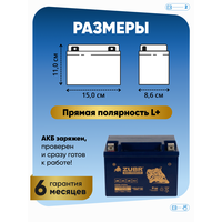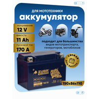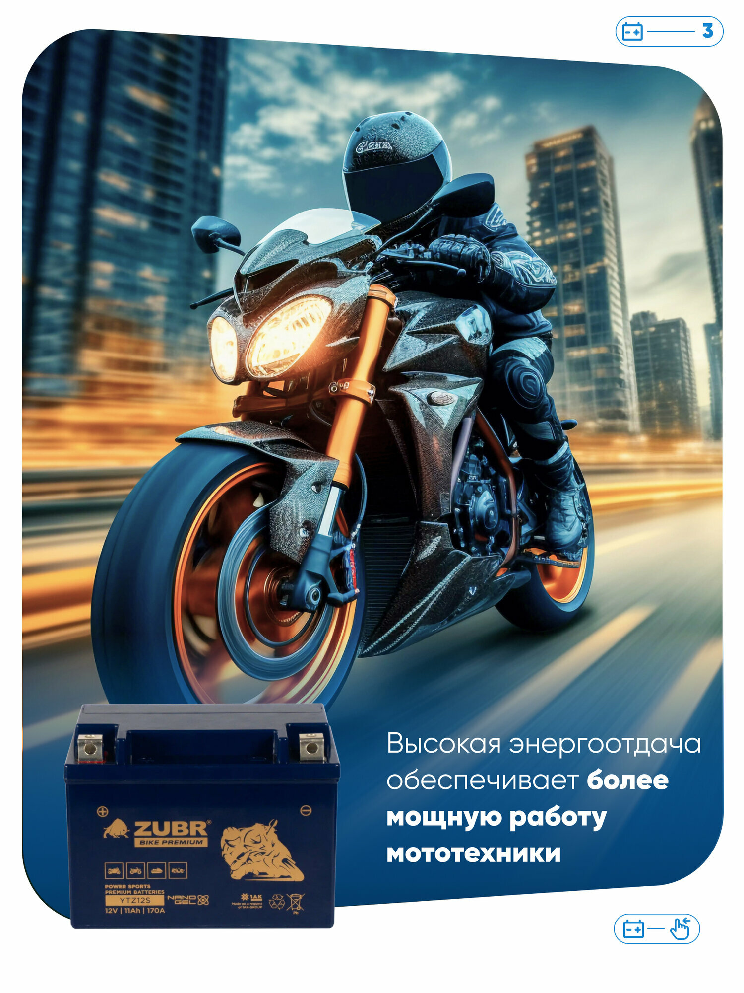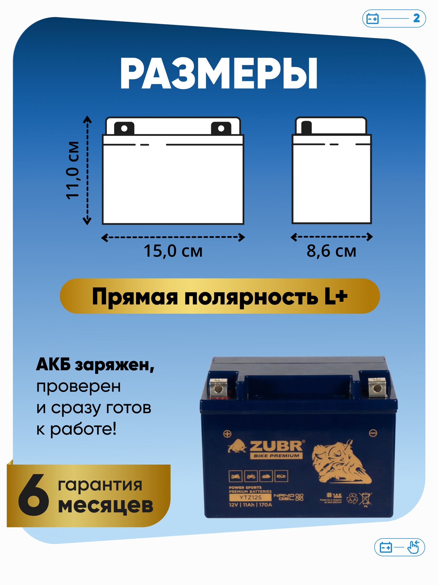 Мото аккумулятор 11 ач ZUBR PREMIUM YTZ12S(GEL) (оем номера СТ 1211; YTZ12S-BS; MT 12-11; SMT 12-11 EBZ12-4 YTZ12S) гарантирует длительный срок службы и превосходную производительность даже в самых экстремальных условиях. Для того, чтобы получить истинное удовольствие от скорости и качества езды, у мотоцикла должен быть не только мощный двигатель, но также и надежный аккумулятор. Правильно подобранный акб на мотоцикл – гарантия длительной поездки и нормального запуска ДВС. Линейка аккумуляторных батарей ZUBR отличается высокой герметичностью и вибростойкостью, имеет прочный корпус из ударостойкого пластика. Долговечность и высокая энергоемкость аккумулятора мотоциклетного 12v гарантируют долгую бесперебойную работу мотобайка. Аккумуляторы для мотоцикла гелевые 12в обладают высокой стартовой мощностью и повышенной энергоотдачей, являются универсальными, подходят для пуска двигателей мототехники: мотоцикл альфа, урал, электро мопед, иж планета юпитер, скутер электрический китайский, гидроцикл, квадроцикл, снегоход, снегоуборщик, снегоочиститель, багги, мотовездеход, питбайк 125, пит байк, трицикл, электротрицикл, мотособака, мотобуксировщик, снегоуборщик, бензогенератор, генератор и др. Аккумулятор мото 12 вольт на альфу GEL отличается стойкостью к глубокому разряду и воздействию низких температур, является необслуживаемым. Мото аксессуары эндуро мужские имеют высокий показатель пускового тока и срок службы более пяти лет. Основные преимущества аккумулятора для мопеда альфа: полностью герметичная конструкция, не допускающая утечку электролита; система внутренней рекомбинации газа акб для скутера 12 в исключает необходимость долива дистиллята; повышенные стартовые характеристики; высокая устойчивость к циклированию, вибрациям при любом стиле езды; адаптированы к российским дорогам и климату. Перед покупкой мототовара узнайте размеры посадочного места. Мотоаккумулятор Зубр прост в установке, может работать в любом положении и позволяет быть уверенным в надежном запуске.