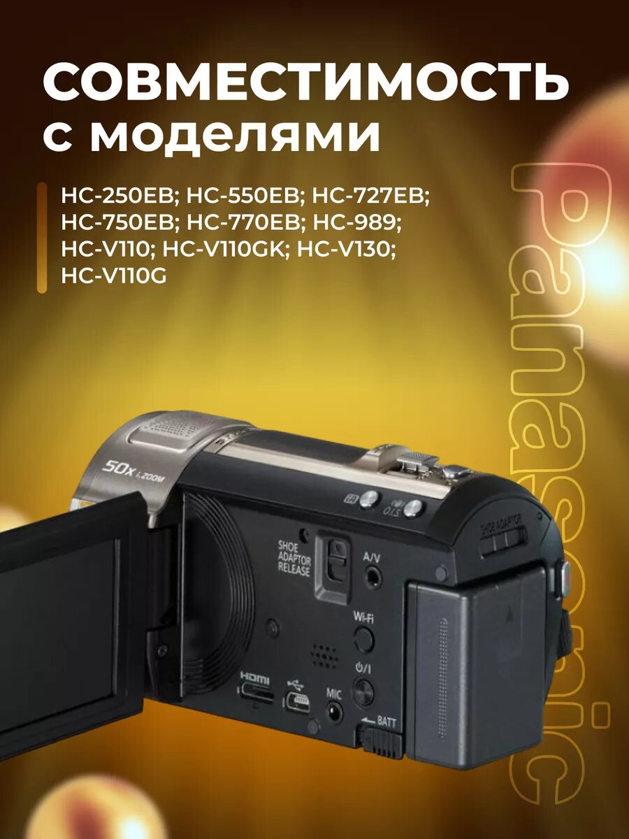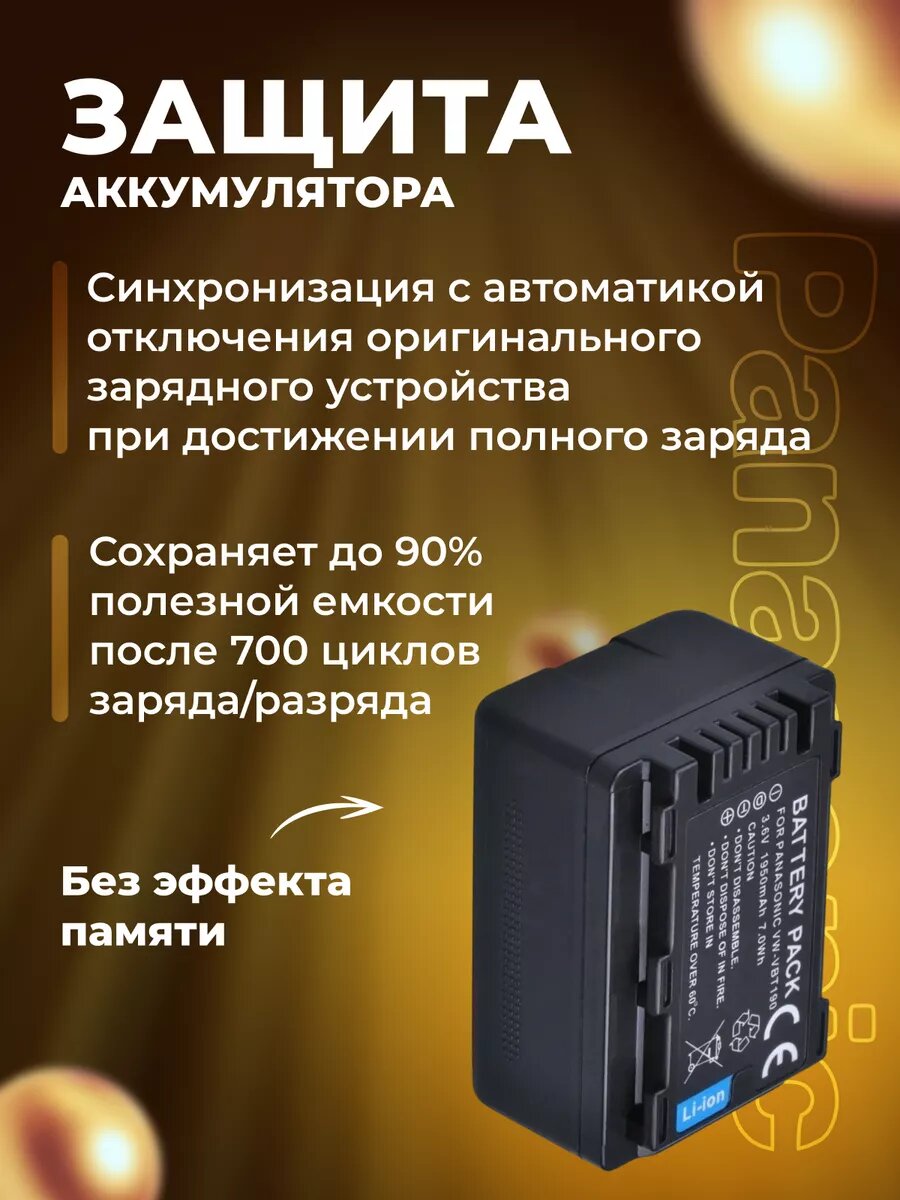 Аккумулятор DuraPro VW-VBT190 для Panasonic емкостью 1950 mAh, позволяющей записывать до 130 минут видео на одном полном заряде при работе с видеокамерами Panasonic серий HC . Сохраняет до 90% своего ресурса после 700 циклов заряда/разряда при регулярном использовании в течение 10 лет.**Заряд и длительность работы**- Используйте все энергоемкие функции вашей современной видеокамеры: полного заряда аккумуляторной батареи DuraPro VW-VBT190 достаточно для записи 130 минут видео- Возможность подзарядки аккумулятора в любое время и при любом остаточном заряде без потери емкости благодаря отсутствию эффекта памяти- Синхронизация с автоматикой отключения оригинального зарядного устройства при достижении полного заряда предотвратит поломку элементов батареи- Сохранение до 90% полезной емкости аккумулятора после 700 циклов заряда/разряда при регулярной эксплуатации в течение 10 лет. Совместимость : HC-250EB • HC-550EB • HC-727EB • HC-750EB • HC-770EB • HC-989 • HC-V110 • HC-V110GK • HC-V110MGK • HC-V130 • HC-V210 • HC-V210GK • HC-V210M • HC-V210MGK • HC-V270 • HC-V520 • HC-V520GK • HC-V520M • HC-V520MGK • HC-V720 • HC-V720GK • HC-V720M • HC-V720MGK • HC-VX870 • HC-W570 • HC-W580 • HC-W850EB • HC- VXF999